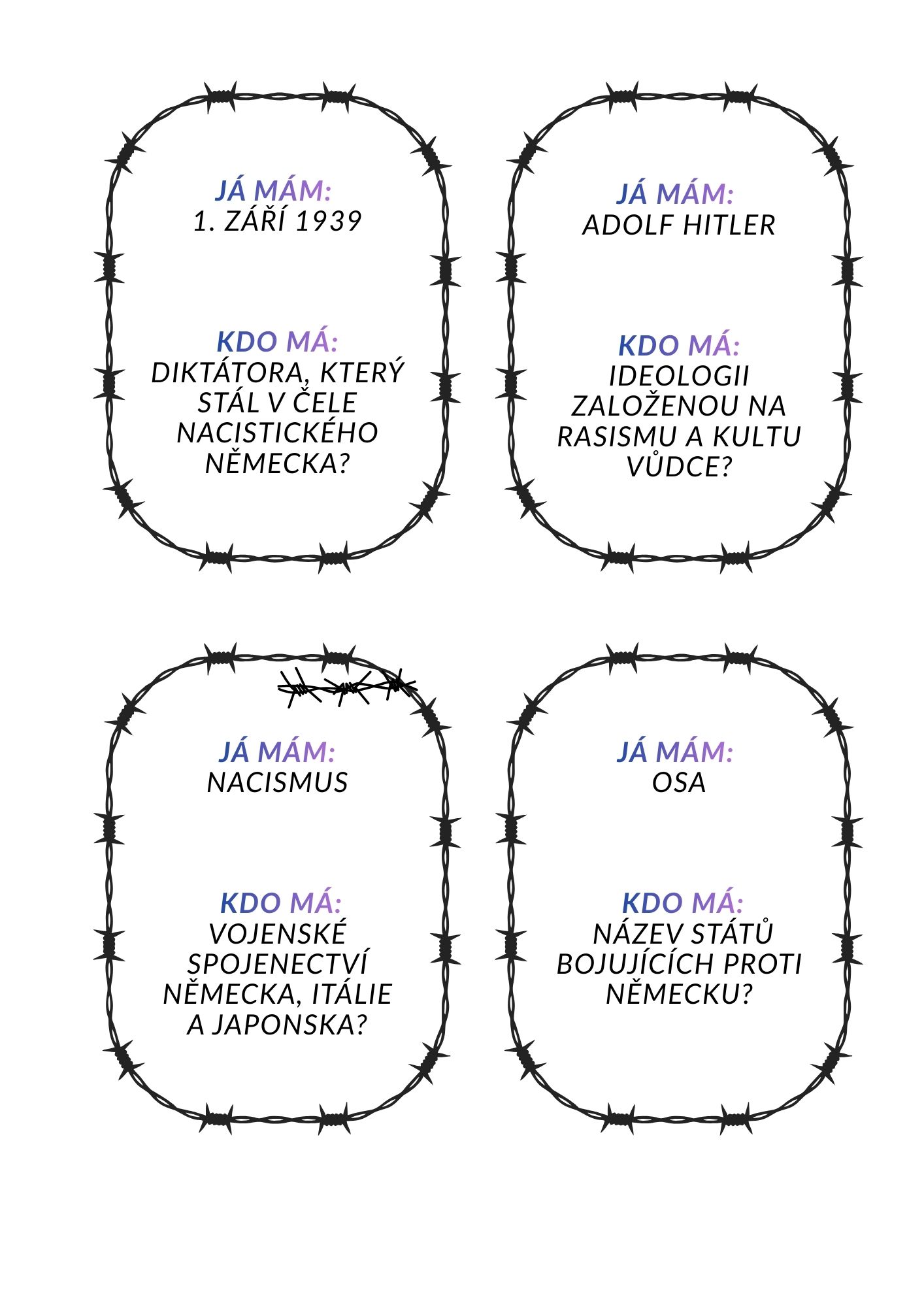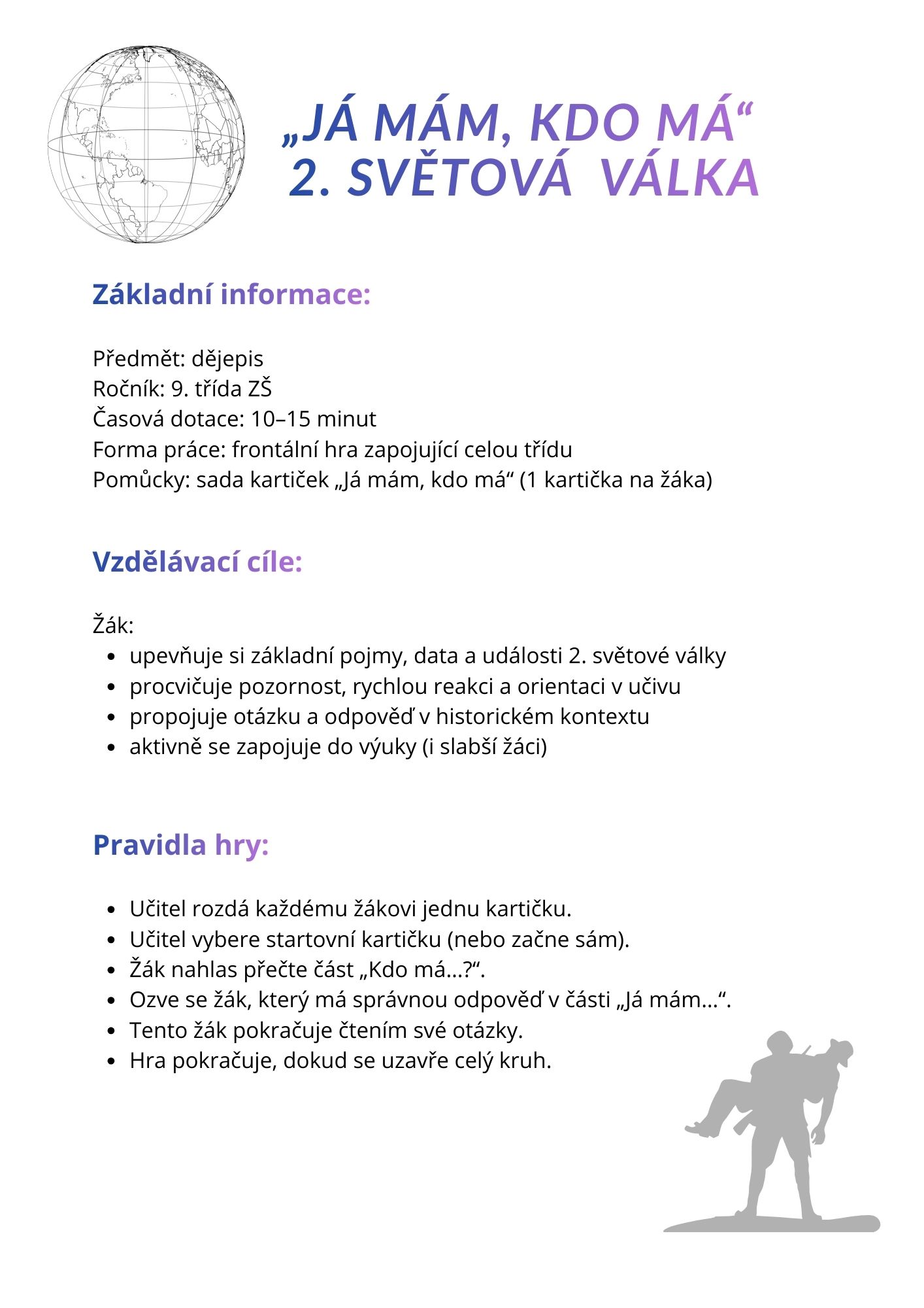 Didaktická hra „Já mám, kdo má“ zaměřená na druhou světovou válku je vhodná pro zpestření výuky dějepisu a opakování učiva. Žáci si hravou formou procvičí základní pojmy, osobnosti, události a letopočty související s tímto historickým obdobím.