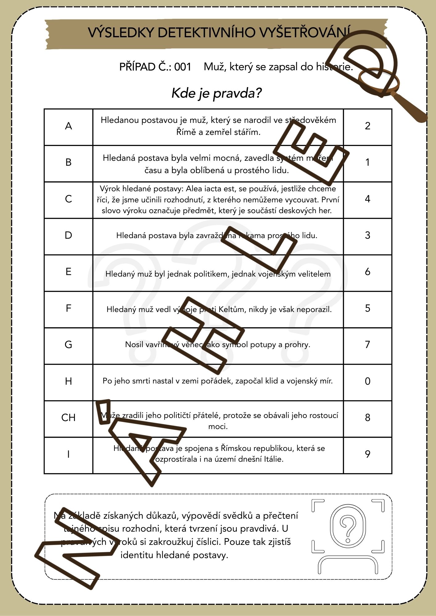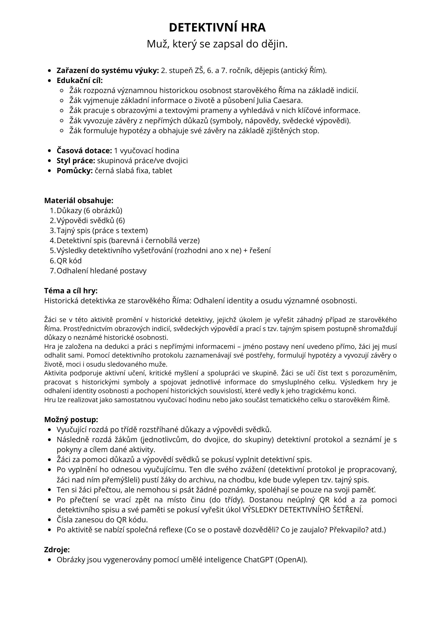 Třída se stává místem činu. Chodba je archiv, kde se nachází tajný spis. Tam se dostanou jen pracovití detektivové. Otevřete učivo antického Říma detektivní hrou. Aktivita podporuje aktivní učení, kritické myšlení a spolupráci ve skupině.