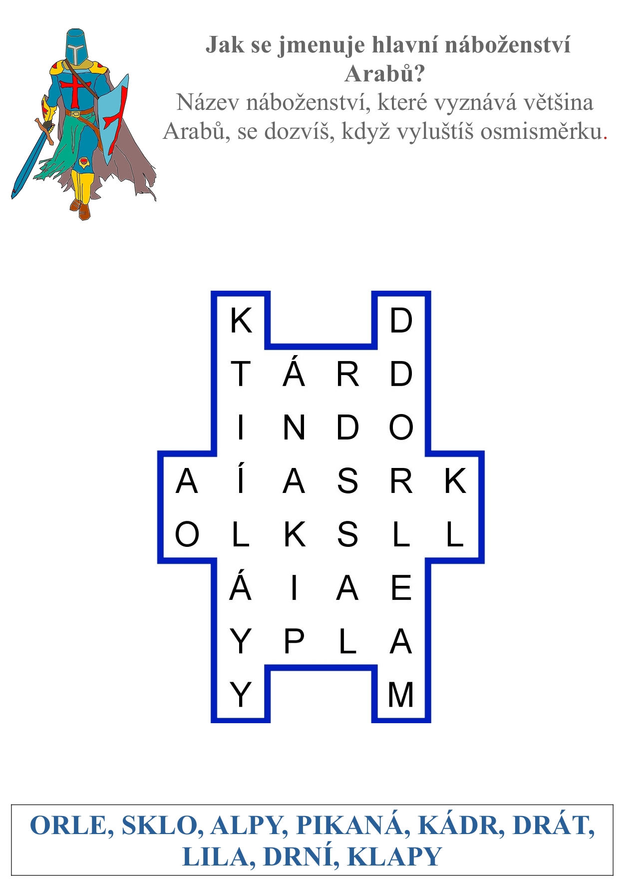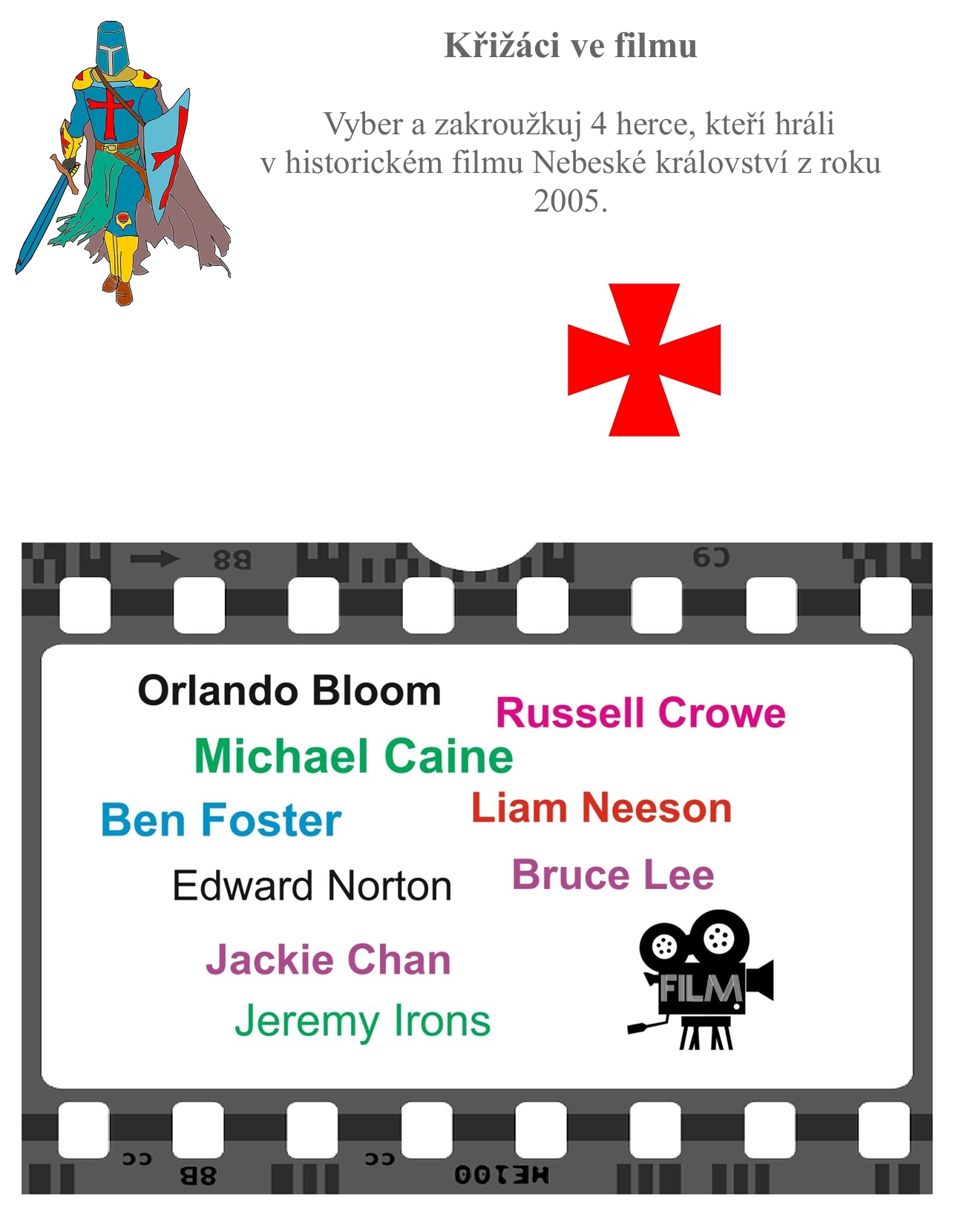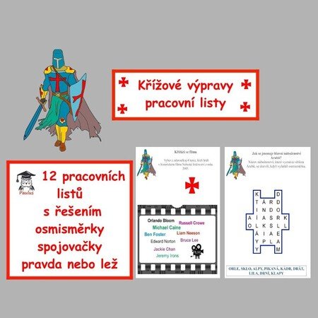 Pracovní listy s názvem Křížové výpravy obsahují úvodní stránku, 12 pracovních listů a řešení pro učitele. Listy mimo jiné obsahují osmisměrky, spojovačky, zjišťování informací o filmu Nebeské království, určování století, otázky z doby Křížových výprav.