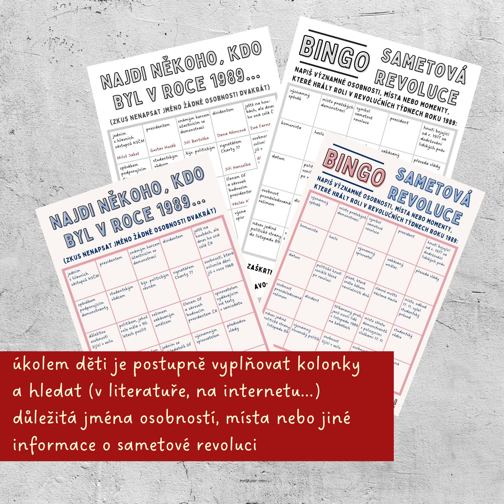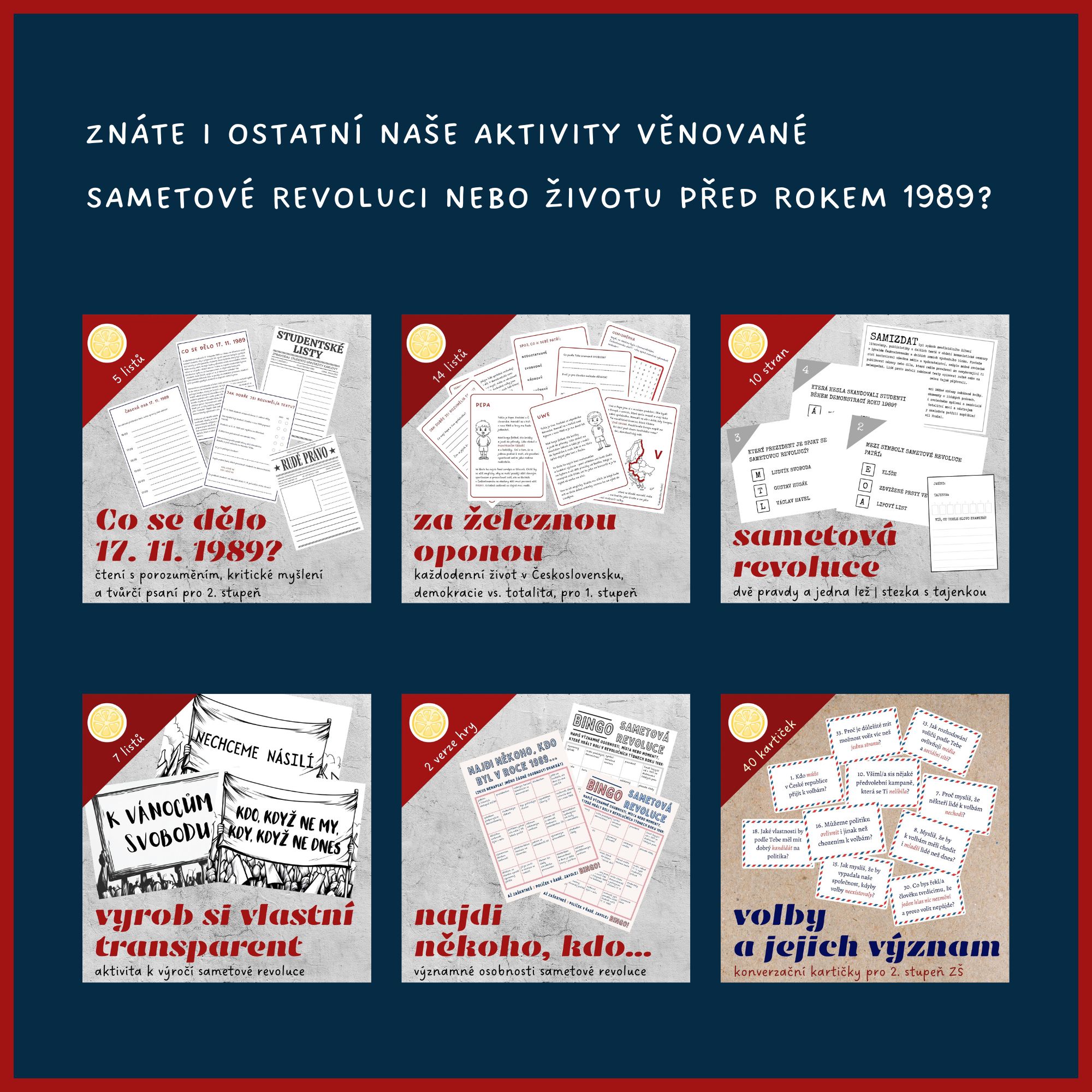 🔑Hledáte další aktivity na oslavu Dne boje za svobodu a demokracii 17. 11.? Podívejte se na pracovní listy CO SE DĚLO 17. 11. 1989, pracovní listy věnované životu ZA ŽELEZNOU OPONOU nebo si VYROBTE VLASTNÍ TRANSPARENT. Svoje znalosti mohou děti ověřit v SAMETOVÉ STEZCE S TAJENKOU.
