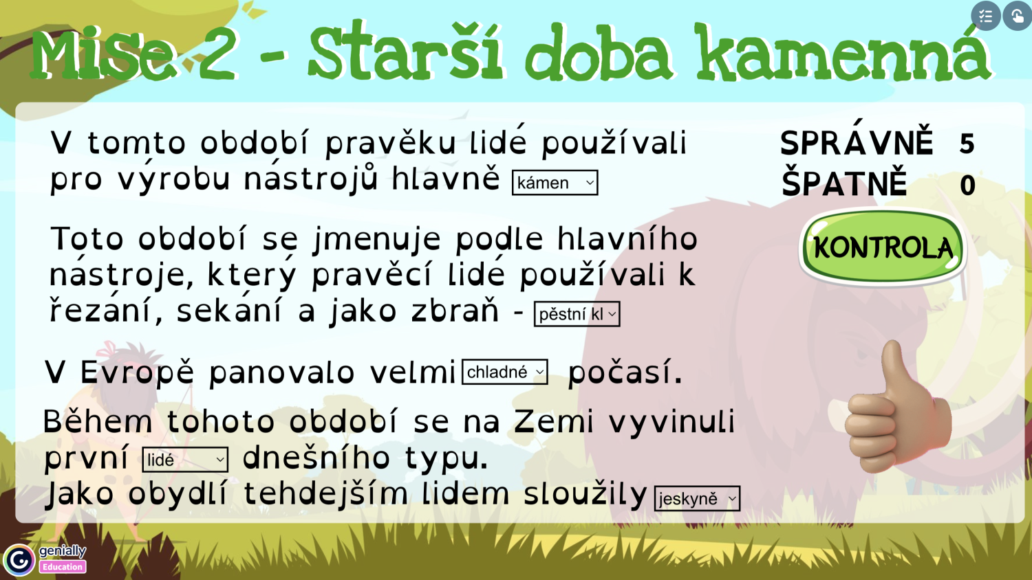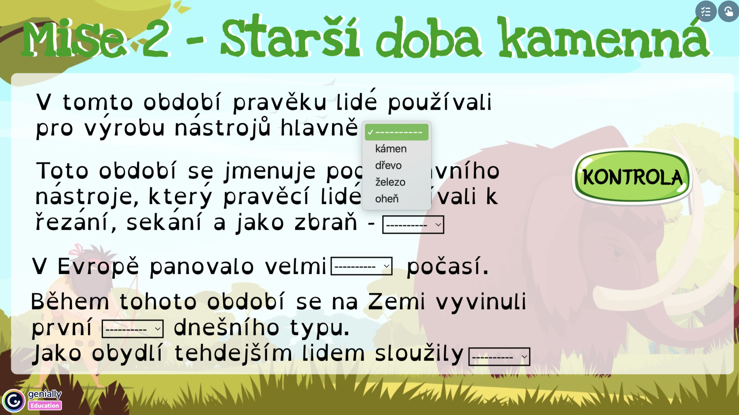 Mise 2 Starší doba kamenná - 2 cvičení typu Dropdown menu se 14 chybějícími slovy. Cvičení obsahují text týkající se dané doby s vynechanými slovy. Hráč z nabídky vybírá správnou možnost. Na závěr se mu zobrazí výsledek, kolik měl správně/špatně. Pokud je něco špatně, musí to opravit, aby se mohl posunout dále.