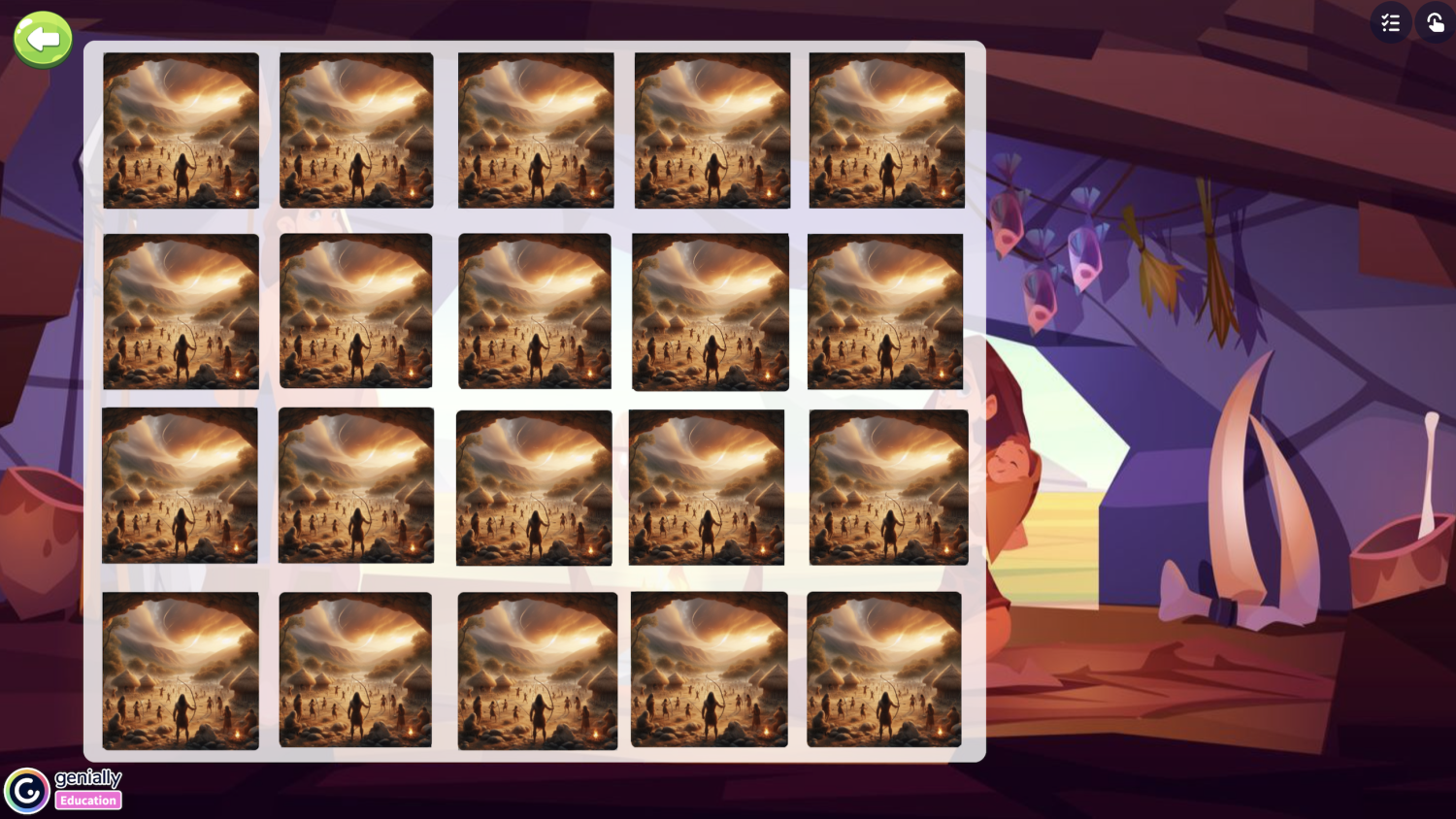 Mise 1 Pexesa - 2 cvičení, každé obsahuje 20 obrázků (10 + 10 dvojic). Snažil jsem se volit odpovídající obrázky z tohoto období. Po úspěšném splnění se objeví GIF, kliknutím na něj se hráč posouvá dál.