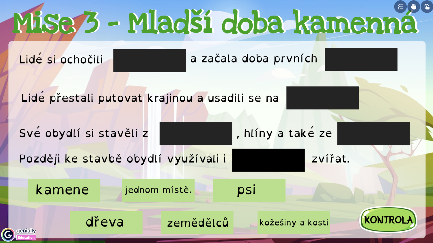 Mise 3 Mladší doba kamenná - 3 cvičení; 2 cvičení obsahují text týkající se dané doby s vynechanými slovy. Hráč z nabídky vybírá správné slovo a přemísťuje na správnou pozici. Pokud je nějaké slovo špatně, vrátí se po kliknutí na “KONTROLA” na původní místo. Pokud je vše správně, objeví se opět GIF a kliknutím na něj se hráč posune dál.