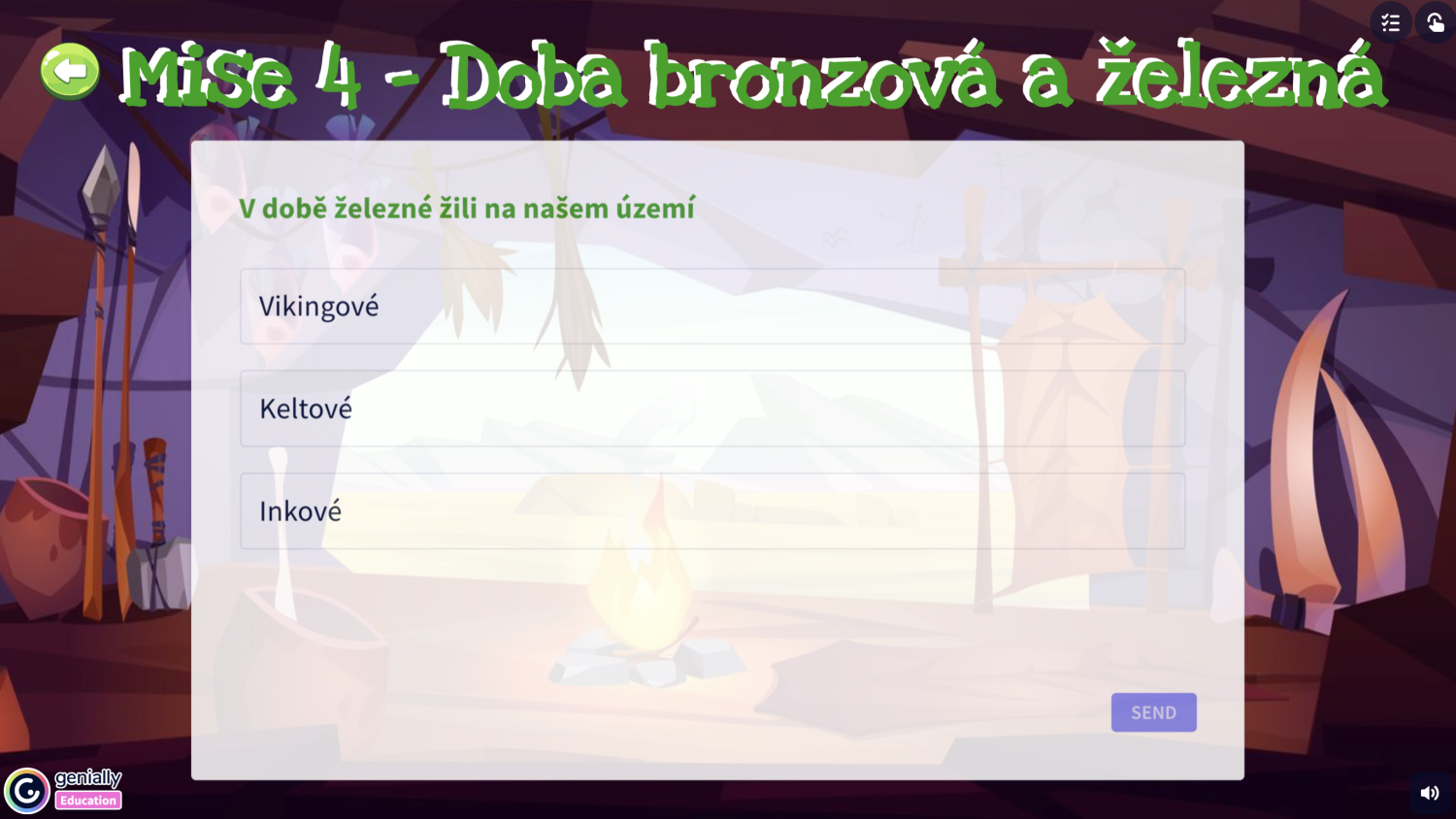 Mise 4 Doba bronzová a železná - Kvíz - 10 otázek z obou období; hráč vybere odpověď a označí ji kliknutím, poté klikne na SEND (odeslat). Pokud je odpověď špatná, nemůže se posunout dál.