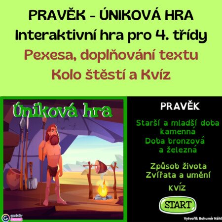 Obsahově a graficky naprosto originální úniková hra na téma PRAVĚK. Jde o typ únikové hry, ve které žáci musí postupně splnit 4 hlavní části. Můžete si vybrat, jestli chcete variantu pro 4. nebo 6. ročník - rozdíl je v grafice, která je u obou verzí úplně jiná. Obsah je stejný. Podívejte se, prosím, na zrychlené video ukázky, které napoví více, než fotografie.