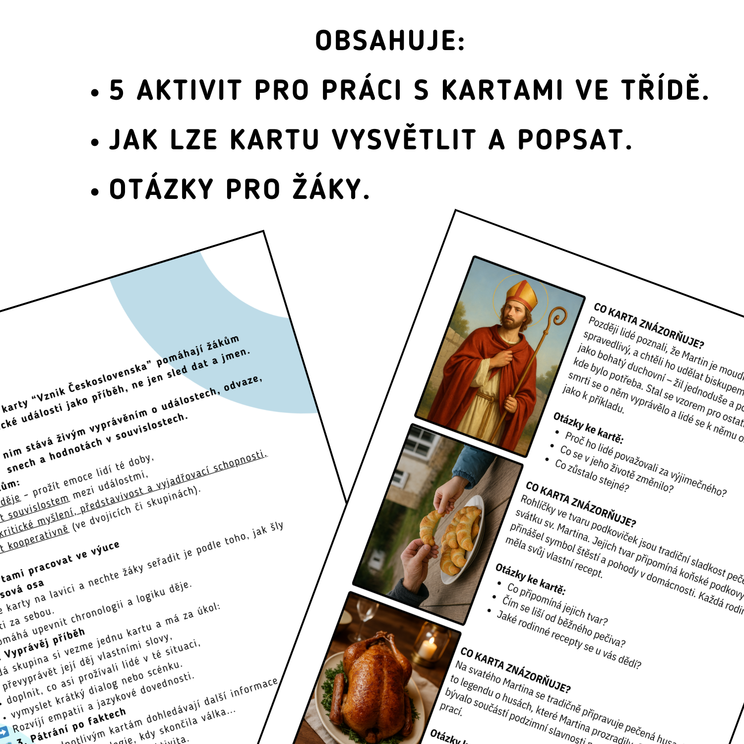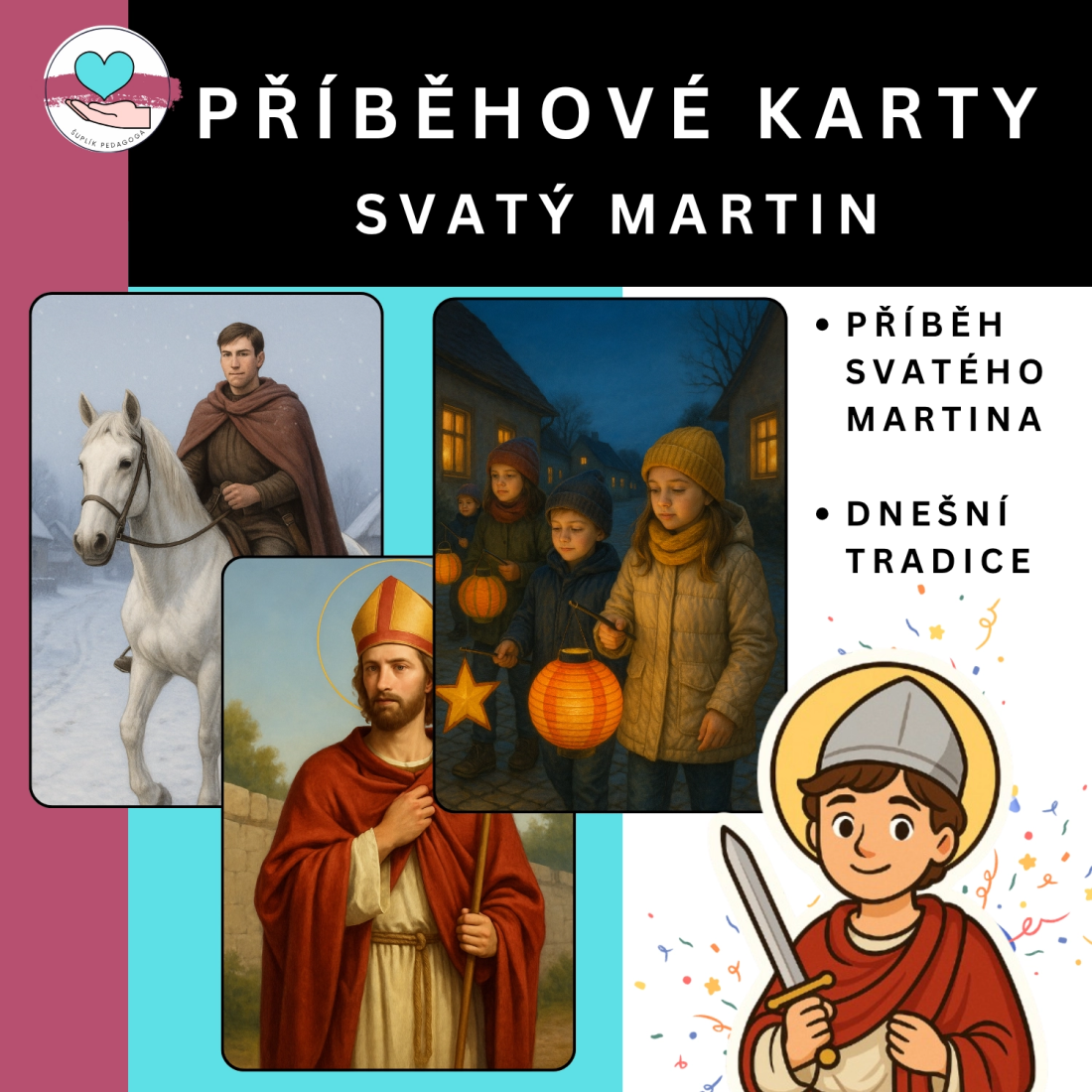 Příběhové karty -SVATÝ MARTIN, pomáhají žákům pochopit události jako příběh, ne jen sled dat a jmen. Hodina se díky nim stává živým vyprávěním o událostech, odvaze, snech a hodnotách v souvislostech.
