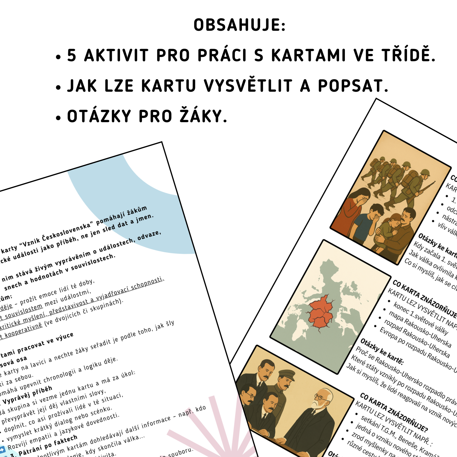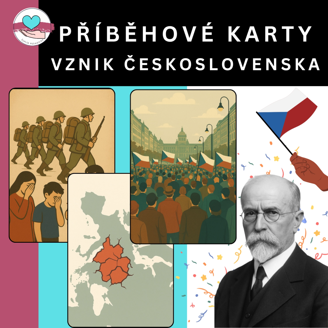 Příběhové karty - vznik Československa, pomáhají žákům pochopit historické události jako příběh, ne jen sled dat a jmen. Hodina se díky nim stává živým vyprávěním o událostech, odvaze, snech a hodnotách v souvislostech.