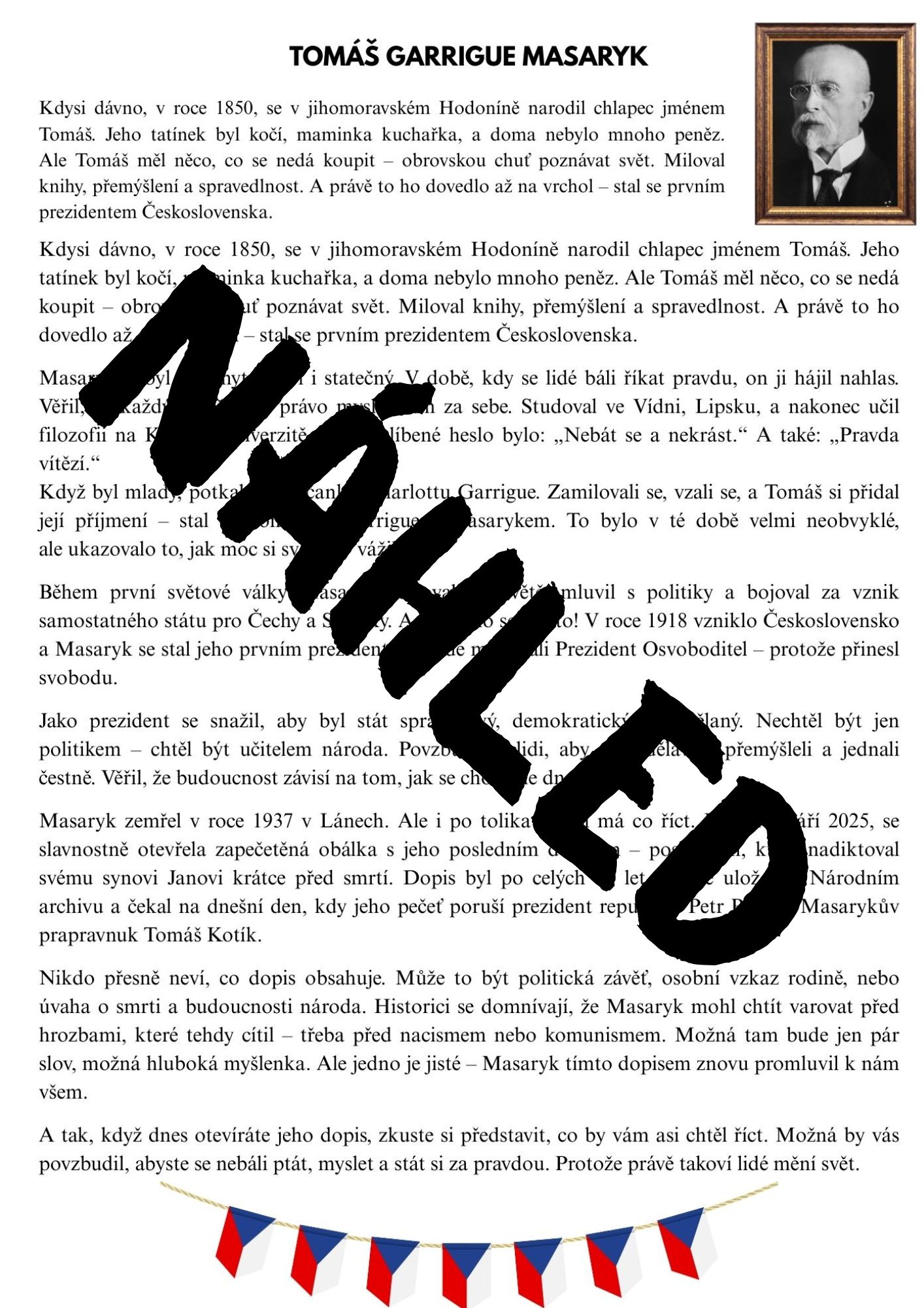 Tento komplexní výukový materiál nabízí učitelům vše, co potřebují k vedení vyučovací hodiny. Součástí je také interaktivní pracovní list pro žáky, který podporuje kritické myšlení, empatii a hlubší porozumění historickému kontextu.