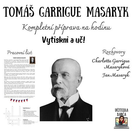 Tento komplexní výukový materiál nabízí učitelům vše, co potřebují k vedení hodiny o T. G. Masarykovi. Obsahuje detailní metodiku minutu po minutě, pracovní list pro žáky a rozhovory s Masarykem, jeho manželkou a synem Janem.