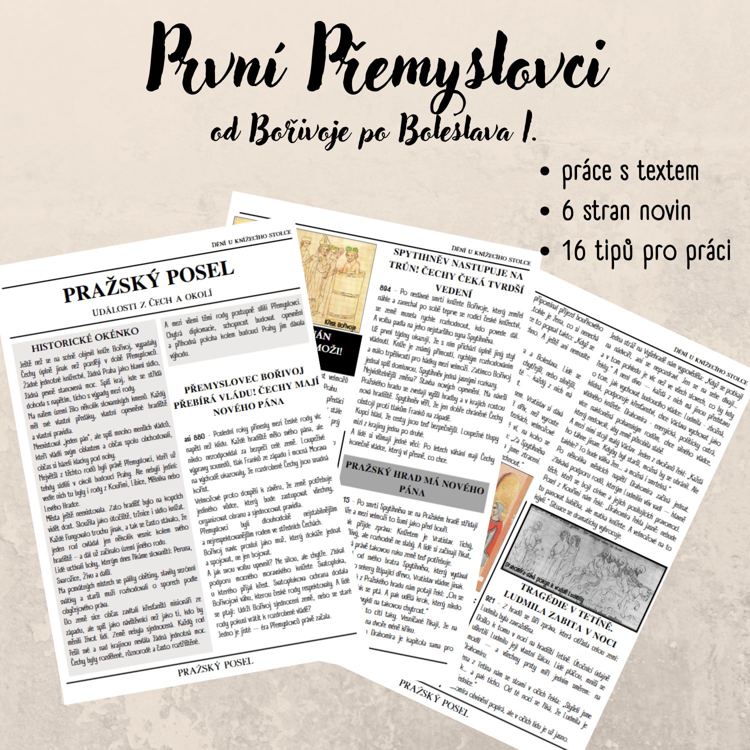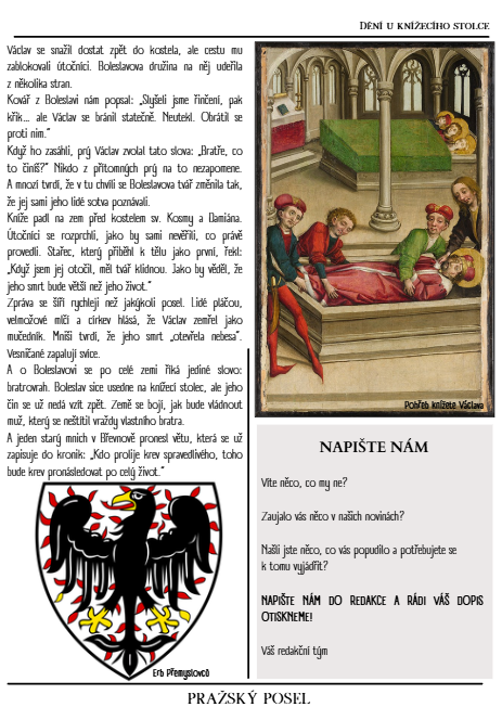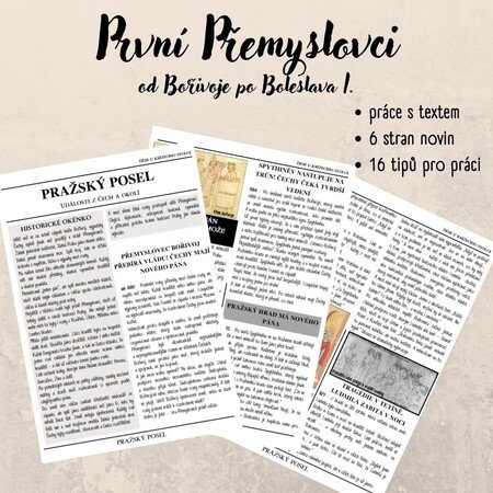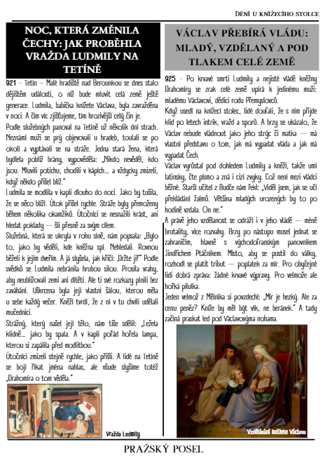 - 6 stran fake historických novin (články jsou smyšlené, ale založené na reálných historických událostech) - od Bořivoje po Boleslava I.