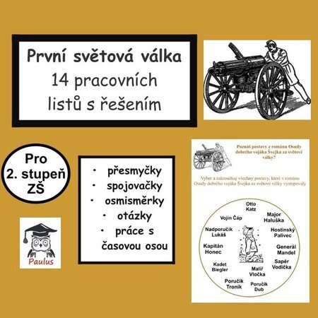 Pracovní listy s názvem První světová válka obsahují úvodní stránku, 14 pracovních listů a řešení pro učitele. Listy mimo jiné obsahují: přesmyčky, spojovačky, osmisměrky, práce s časovou osou, otázky a vysvětlování dobových pojmů.