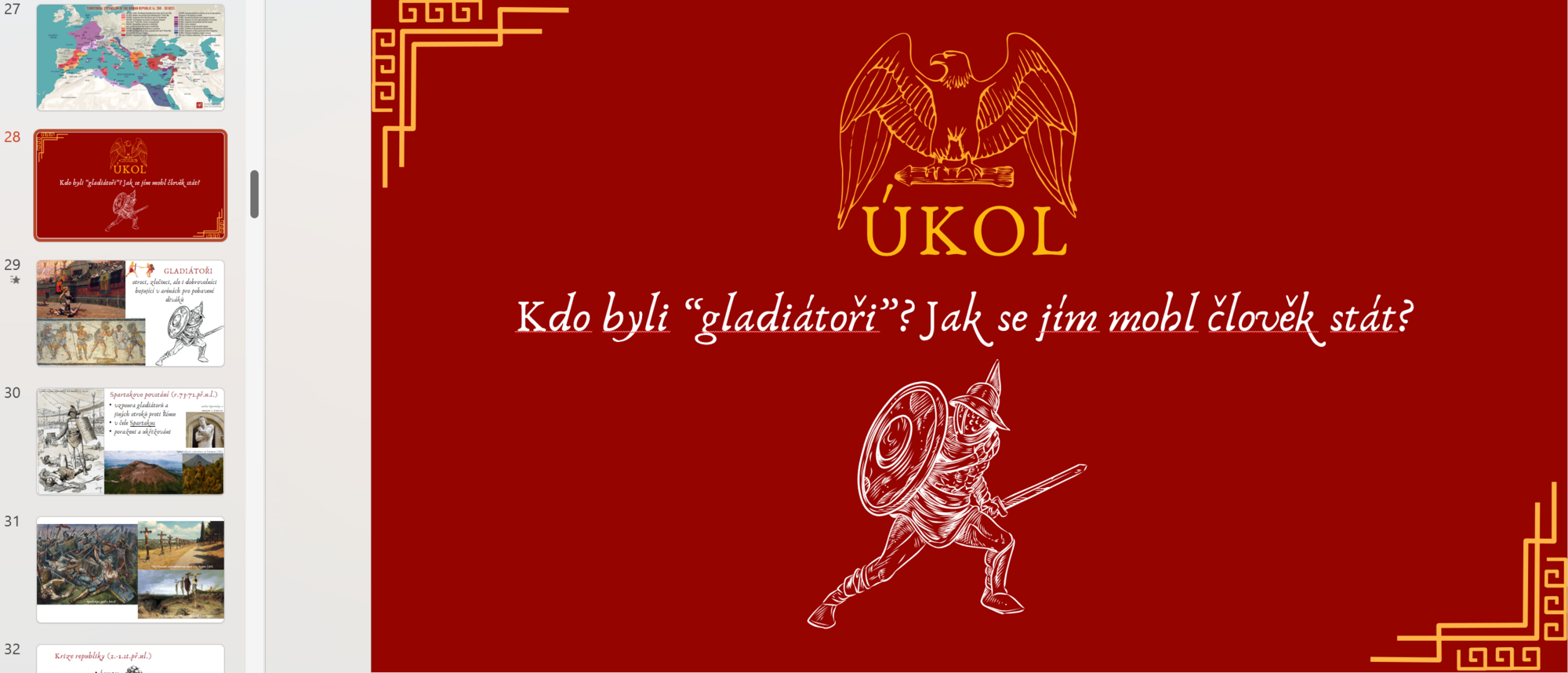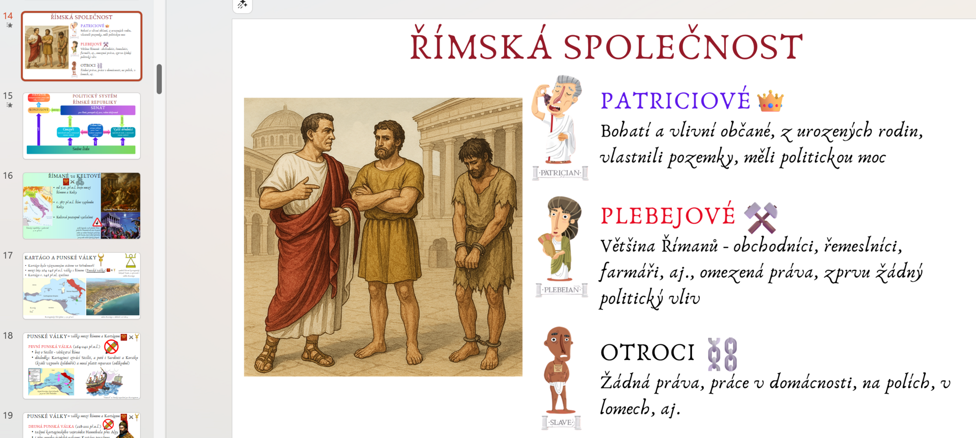 Jedná se o první část prezentace o Římské říši (od vzniku až po konec republiky), která klade důraz na vizuální vjemy, Obsahuje rovněž otázky a zamyšlení pro děti, a odkazy na relevantní videa k tématu.