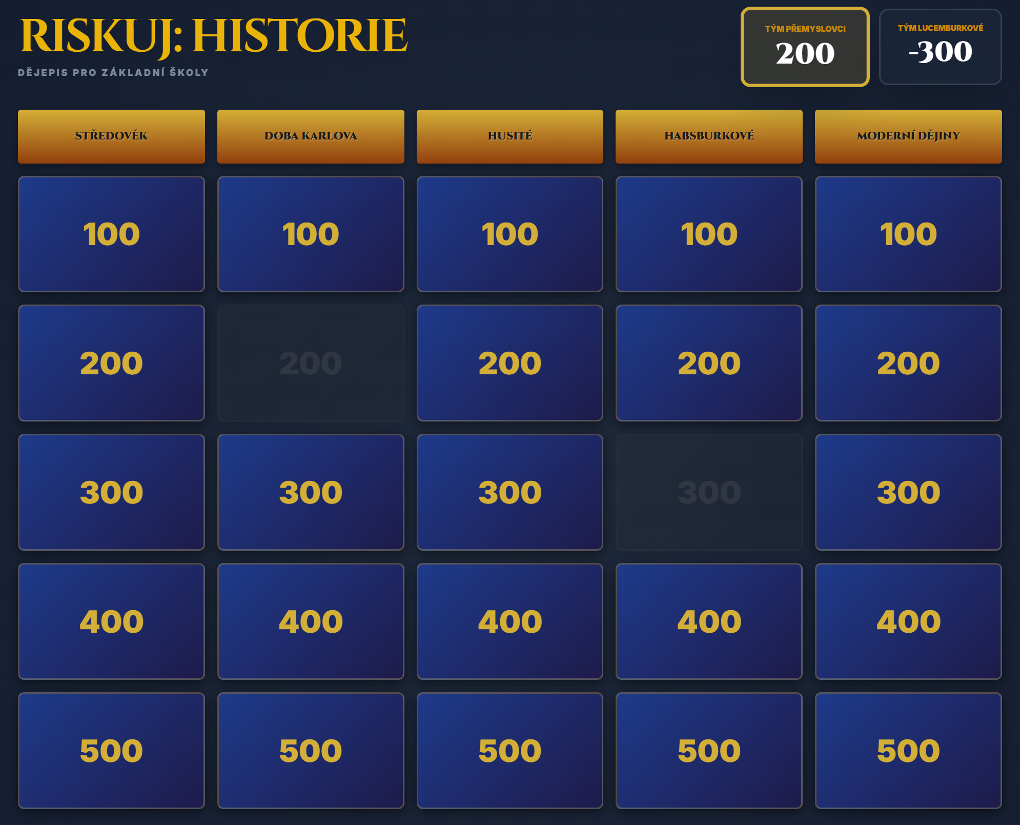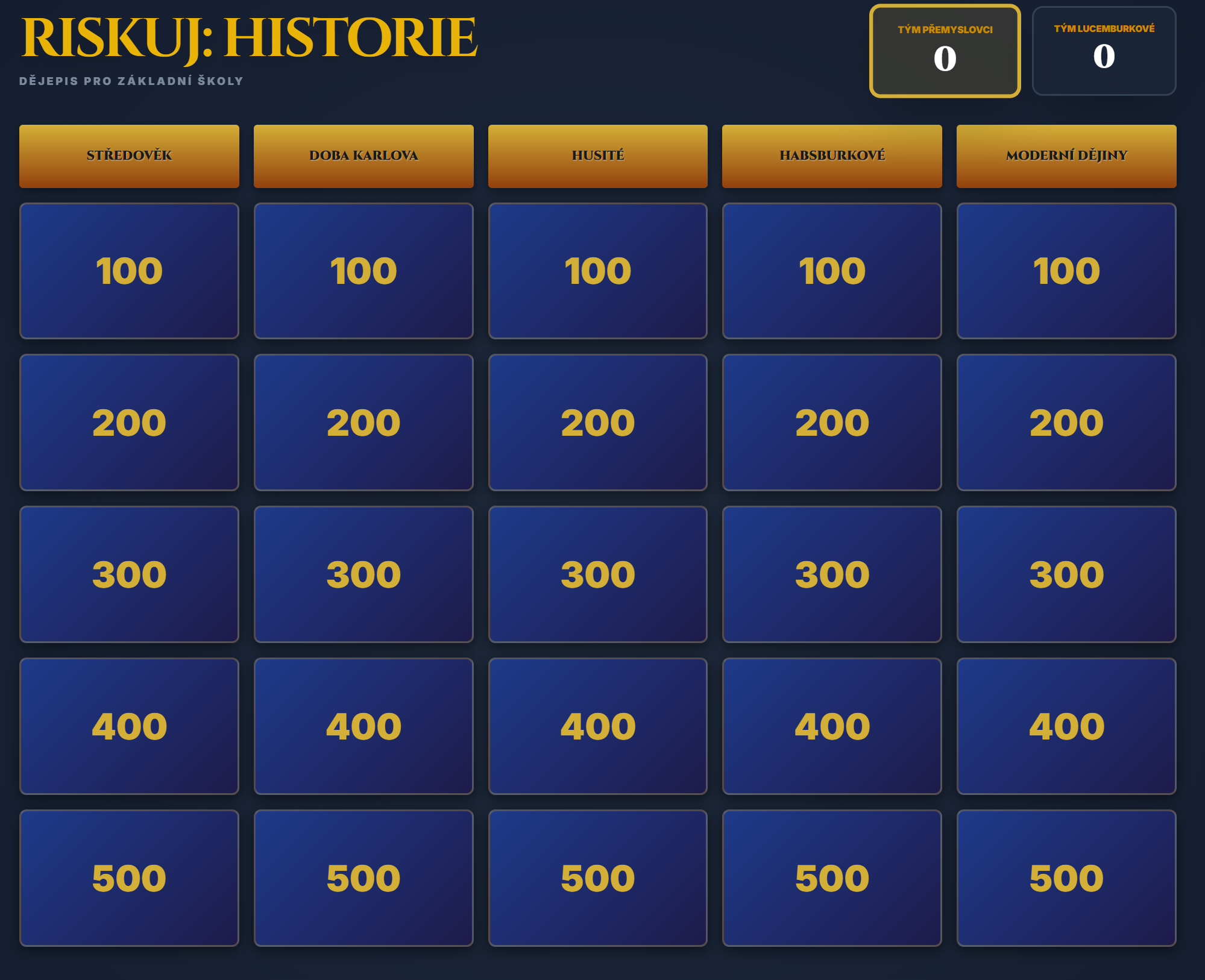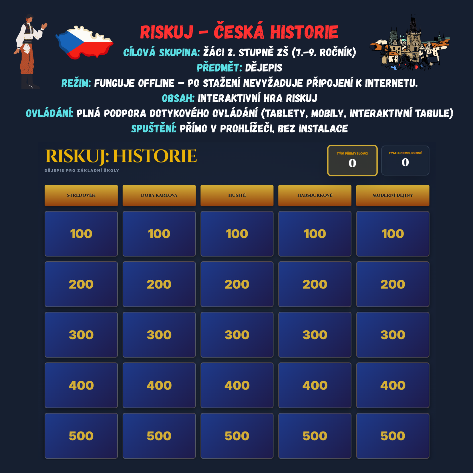 Tato interaktivní vzdělávací hra přenáší populární televizní soutěžní formát do prostředí školní třídy. Je navržena jako komplexní opakovací nástroj pro žáky 2. stupně ZŠ, který propojuje faktografické znalosti z pěti klíčových období českých dějin s prvkem zdravé soutěživosti. Snadné spuštění. Návod součástí. Off-line režim. Vhodné pro interaktivní tabule, Pc, mobily i tablety.