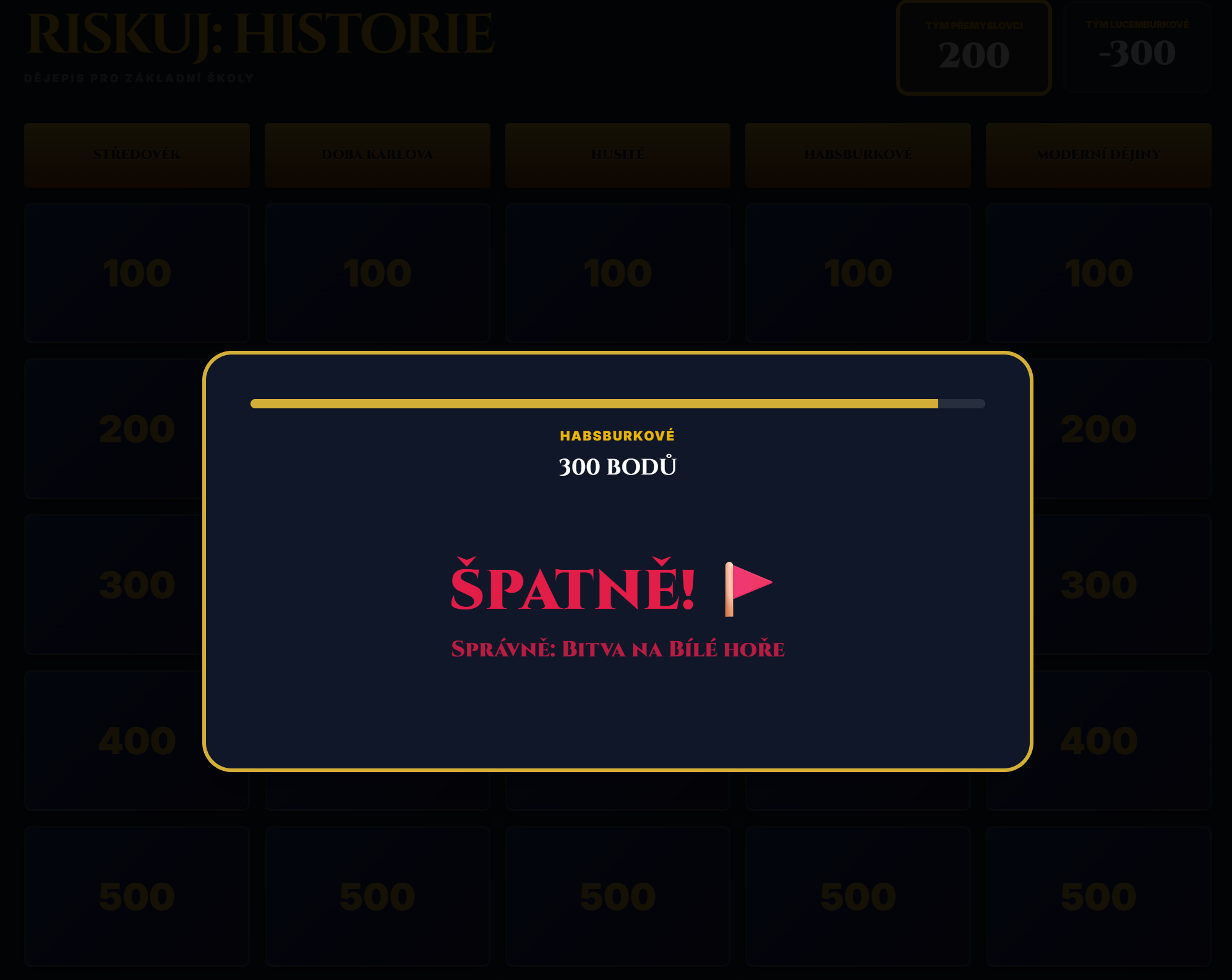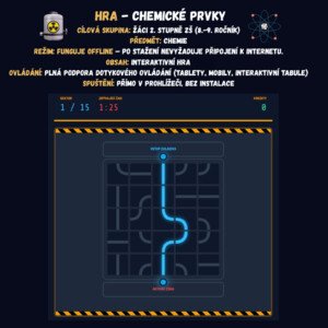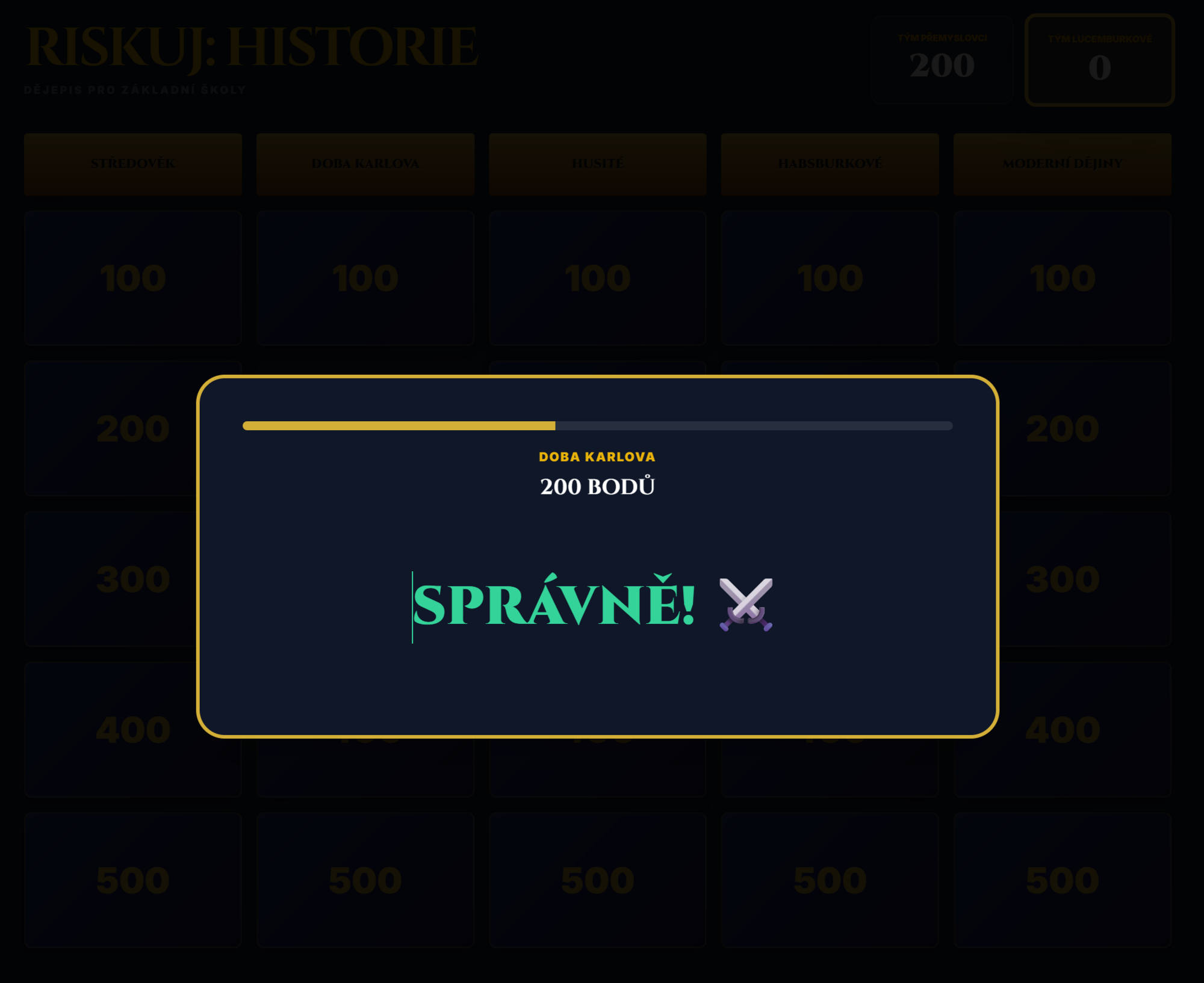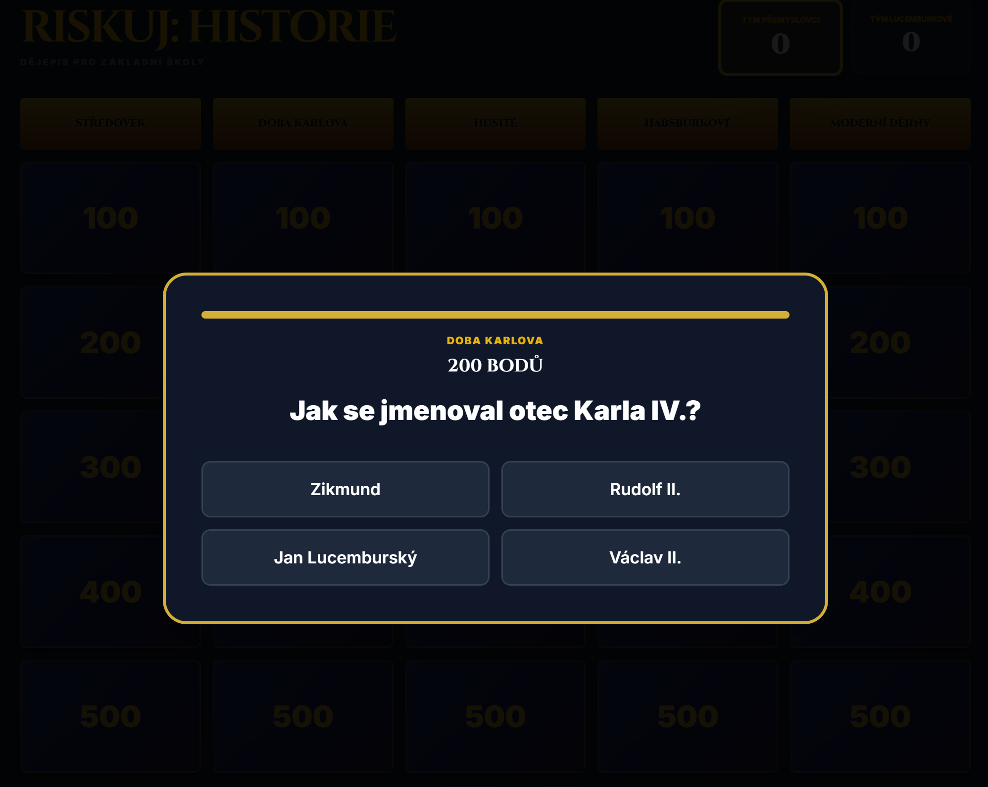 Tato interaktivní vzdělávací hra přenáší populární televizní soutěžní formát do prostředí školní třídy. Je navržena jako komplexní opakovací nástroj pro žáky 2. stupně ZŠ, který propojuje faktografické znalosti z pěti klíčových období českých dějin s prvkem zdravé soutěživosti. Snadné spuštění. Návod součástí. Off-line režim. Vhodné pro interaktivní tabule, Pc, mobily i tablety.