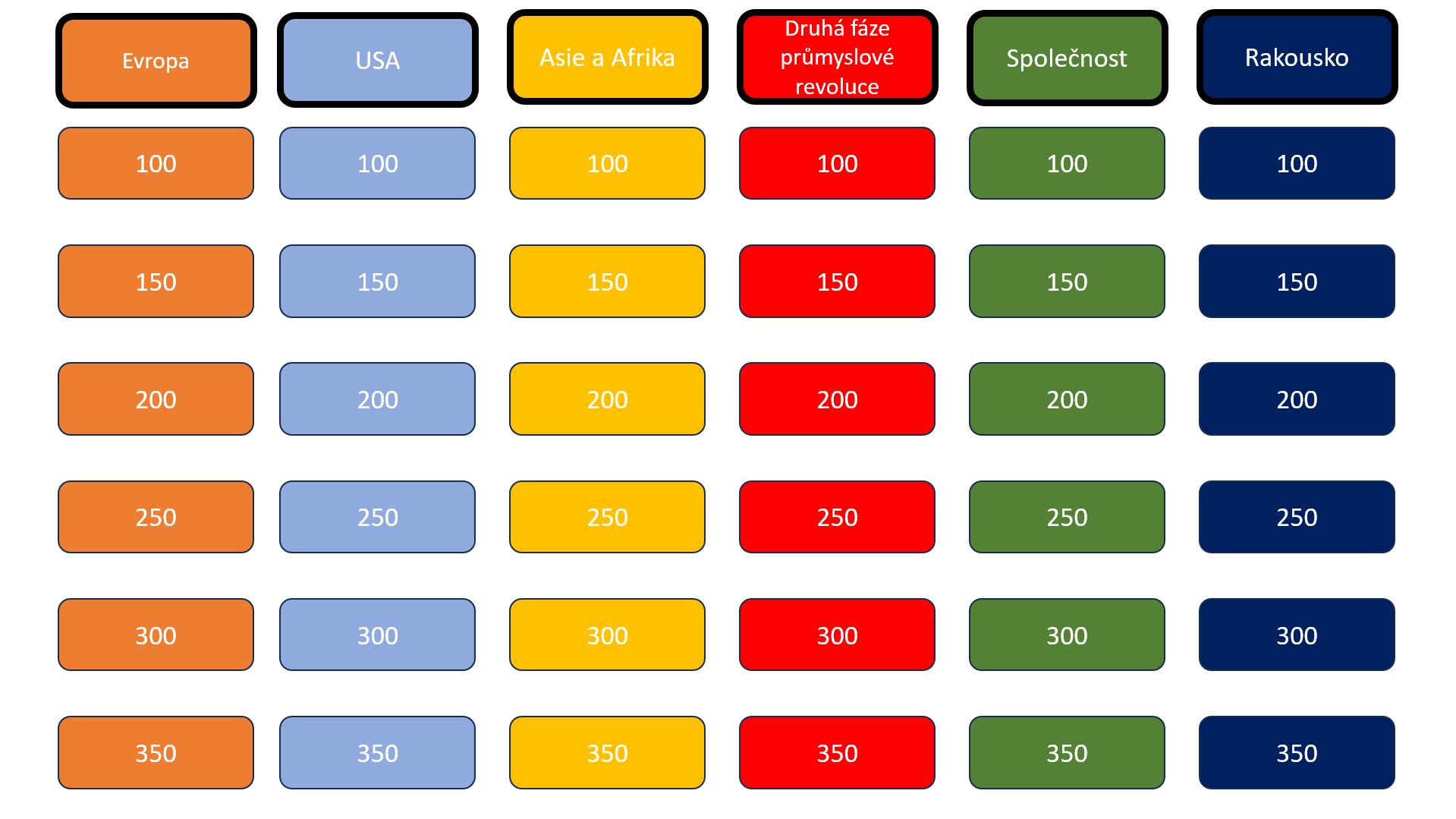 Ve výběrovém slidu je 6 sloupců, a každý obsahuje otázky na jedno téma. První sloupec je na téma Evropa, druhý je na téma USA, a tak dále.