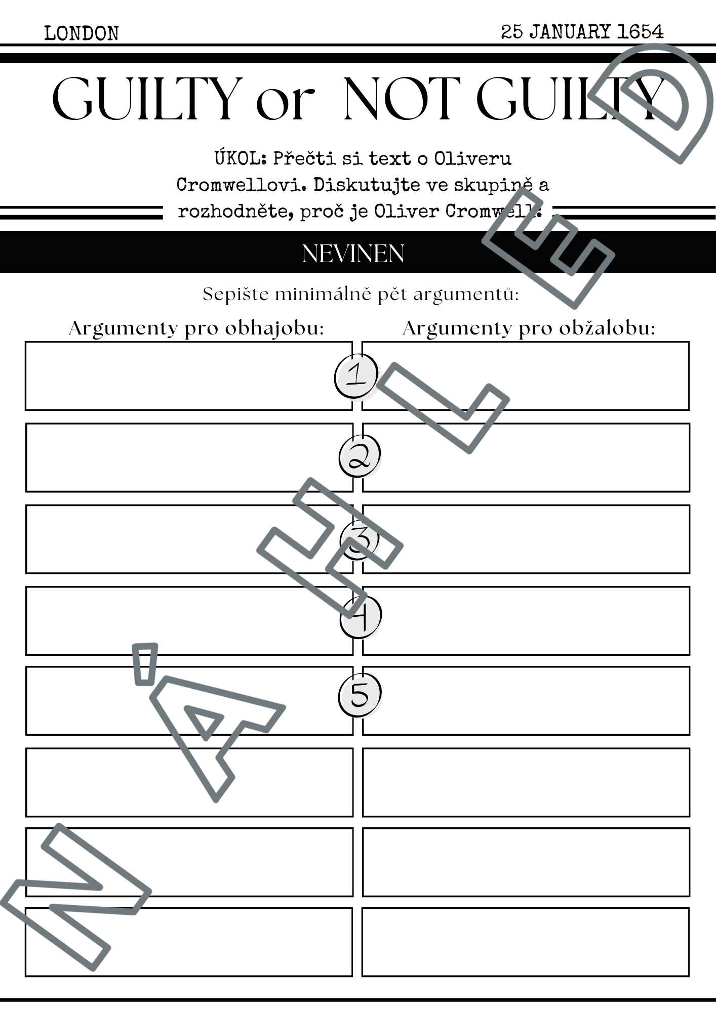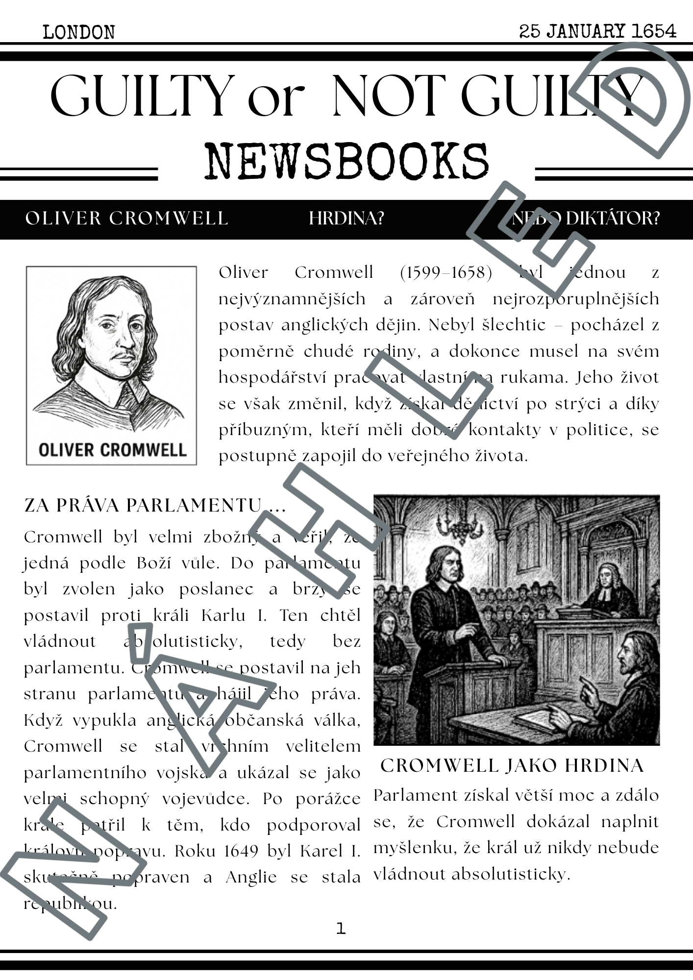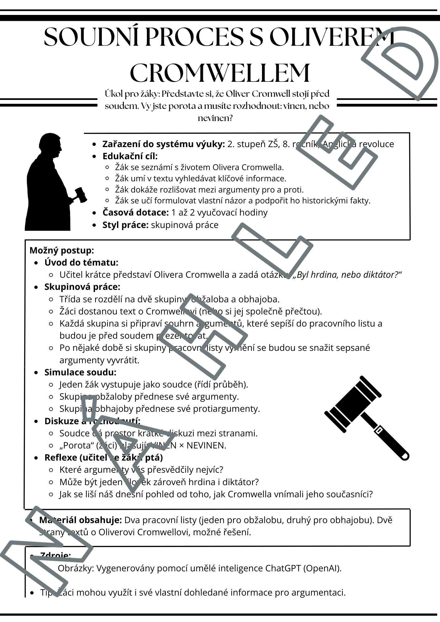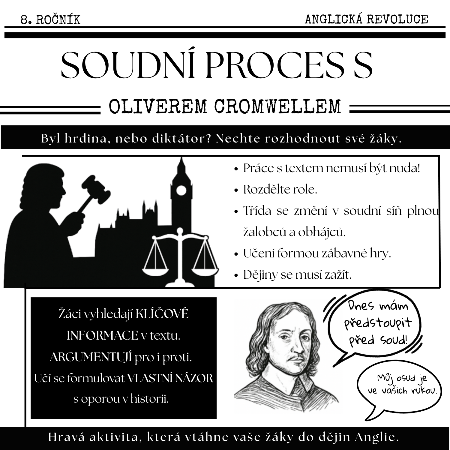 Zapojte své žáky do hry, ve které obhájí, nebo odsoudí Olivera Cromwella. Vaši žáci se stanou soudci historie a samotné dějiny ožijí v soudní síni. Zábavná aktivita, která promění dějepis v dramatický příběh - diskuze, argumenty, napětí.