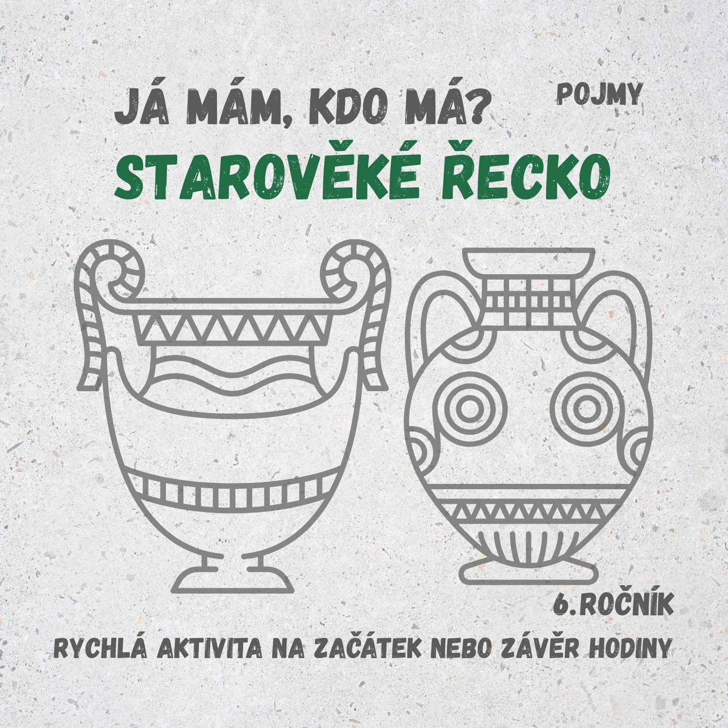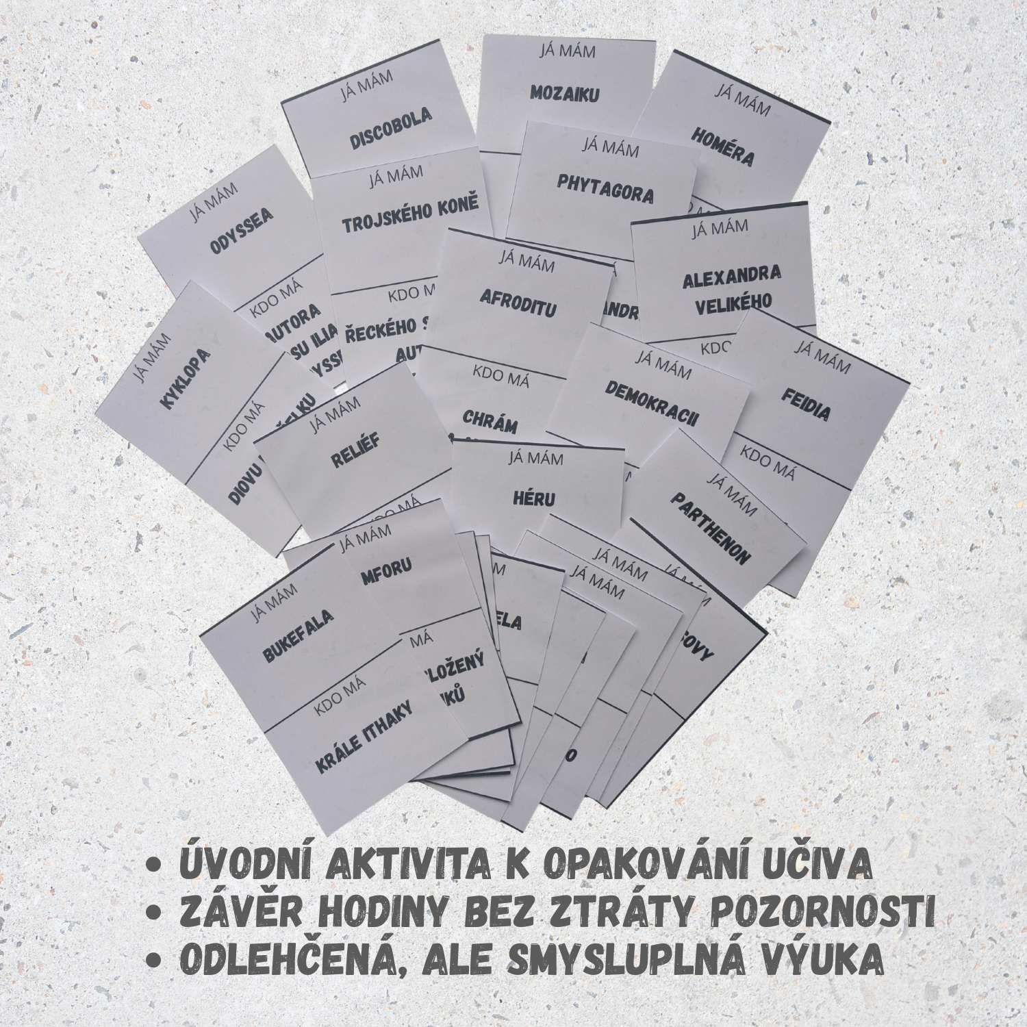 Materiál „Já mám, kdo má? – Starověké Řecko“ je jednoduchá, ale velmi účinná opakovací hra, která zapojí celou třídu najednou. Každý žák pracuje se svou kartou a společně vytvářejí plynulý řetězec pojmů ze starověkého Řecka. Ideální, když chcete žáky vtáhnout, rozhýbat a přitom procvičit klíčové pojmy bez nudy.