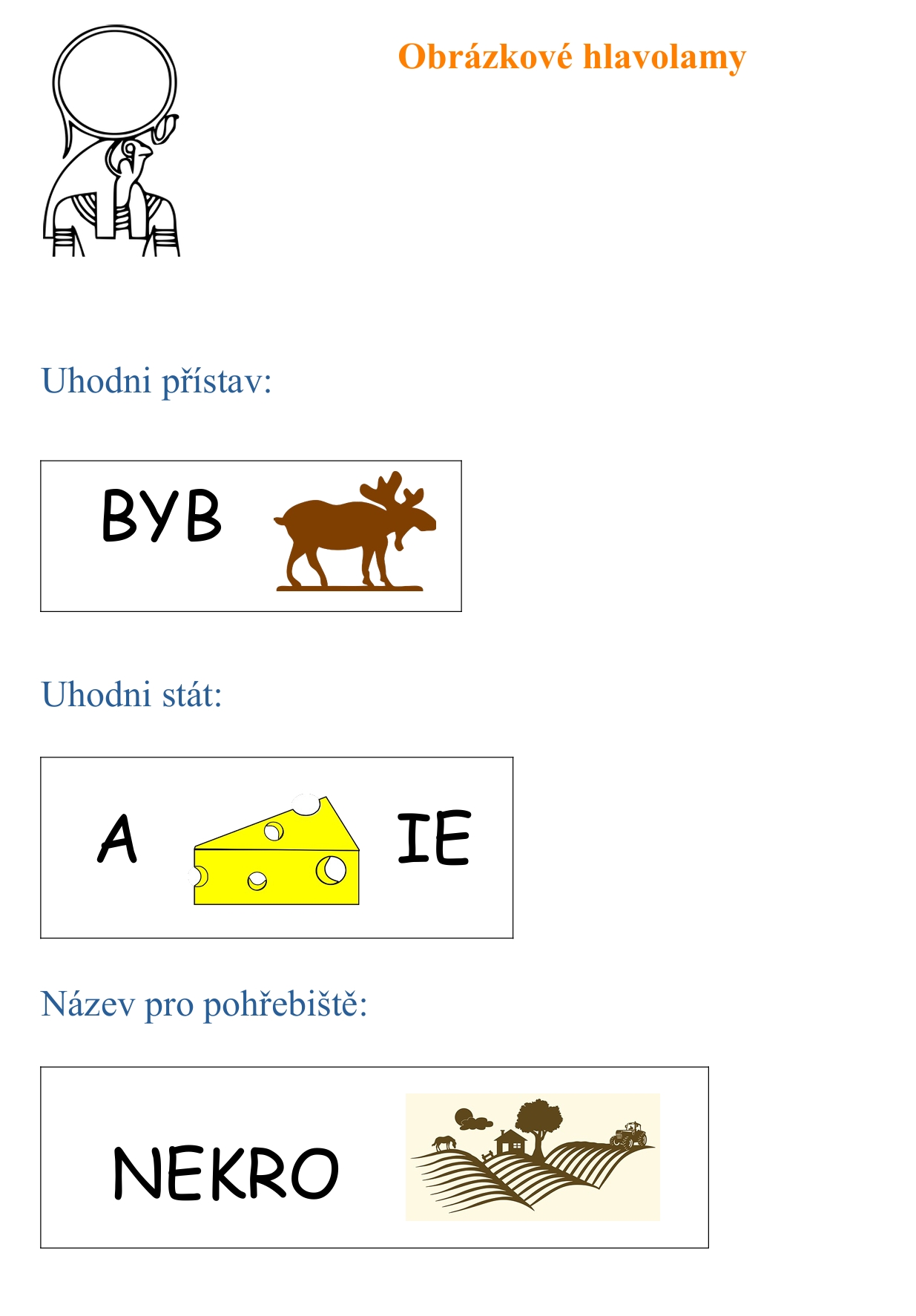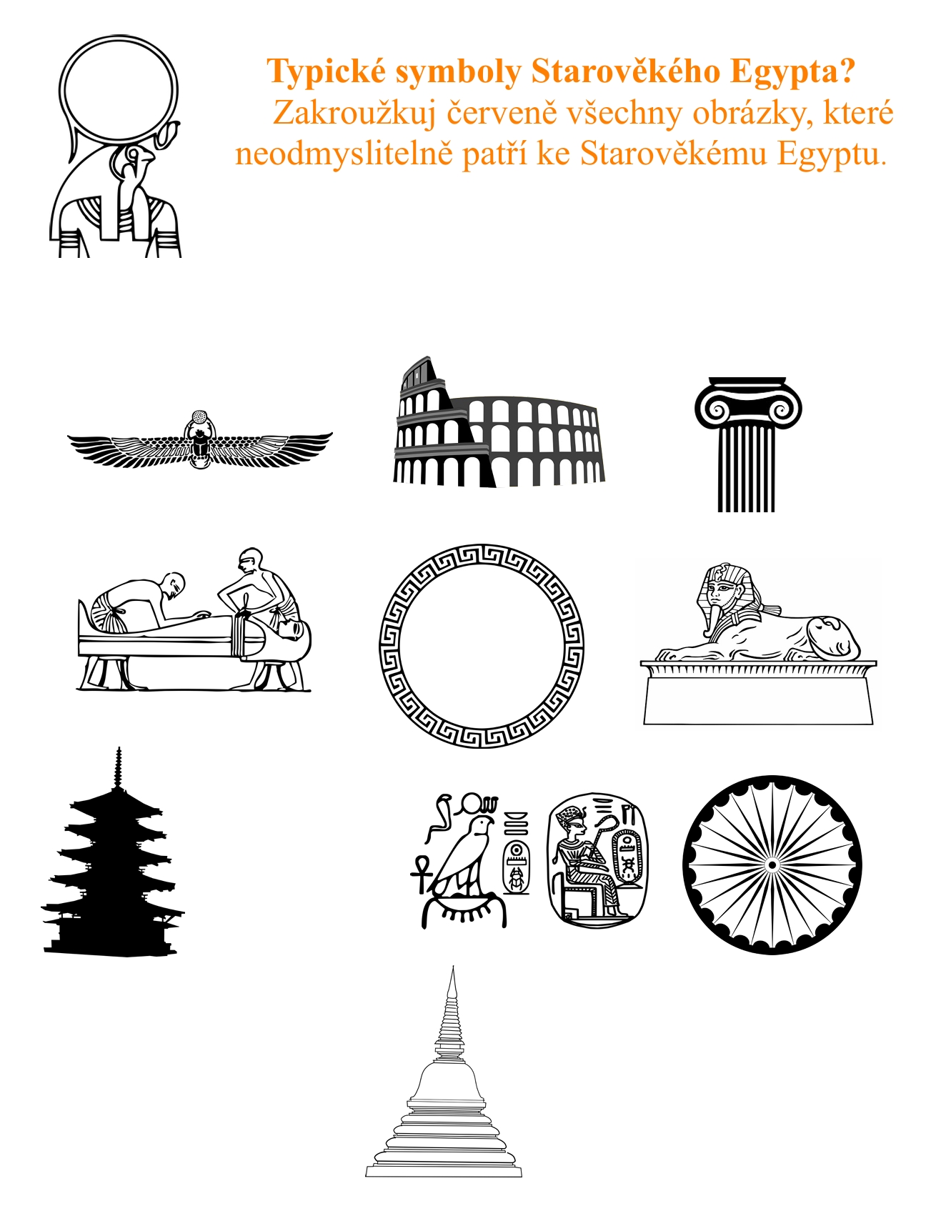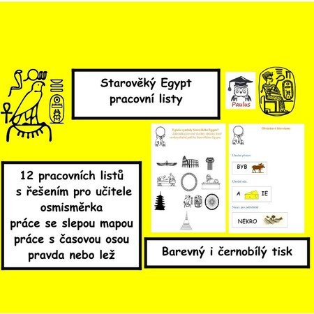 Pracovní listy s názvem Starověký Egypt obsahují úvodní stránku, 12 pracovních listů a řešení pro učitele. Listy mimo jiné obsahují obrázkové hlavolamy, spojovačky, osmisměrku, poznávaní symbolů Starověkého Egypta, soutěž pravda a lež.
