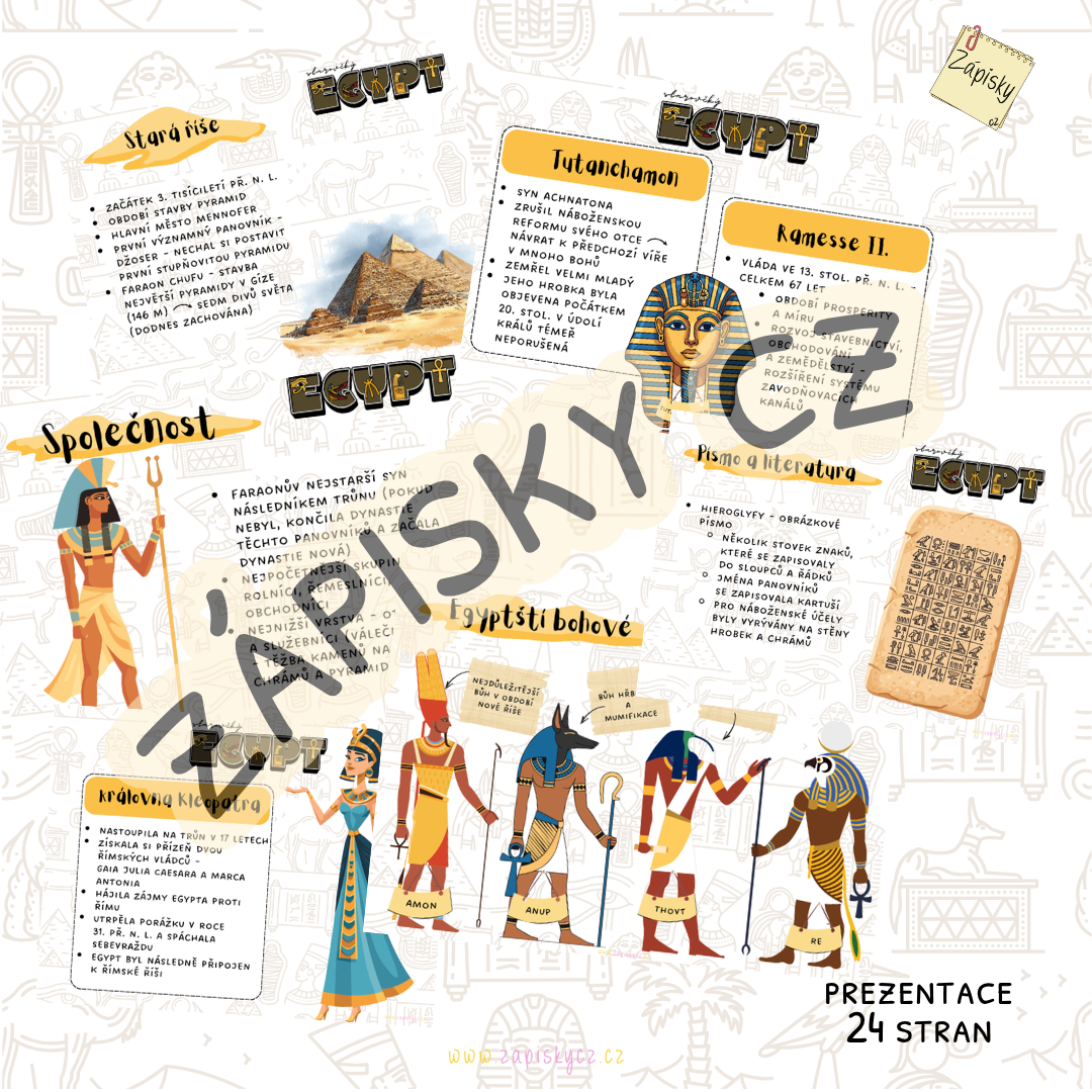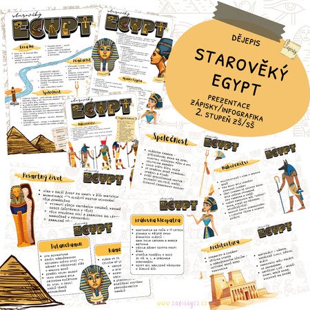 Tento materiál je určen pro výuku dějepisu na ZŠ a v odpovídajících ročnících víceletých gymnázií. Slouží jako ucelený přehled učiva k tématu starověkého Egypta a je vhodný jak pro přímou práci v hodině, tak pro samostatné studium žáků.