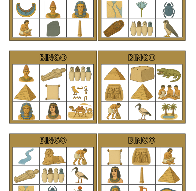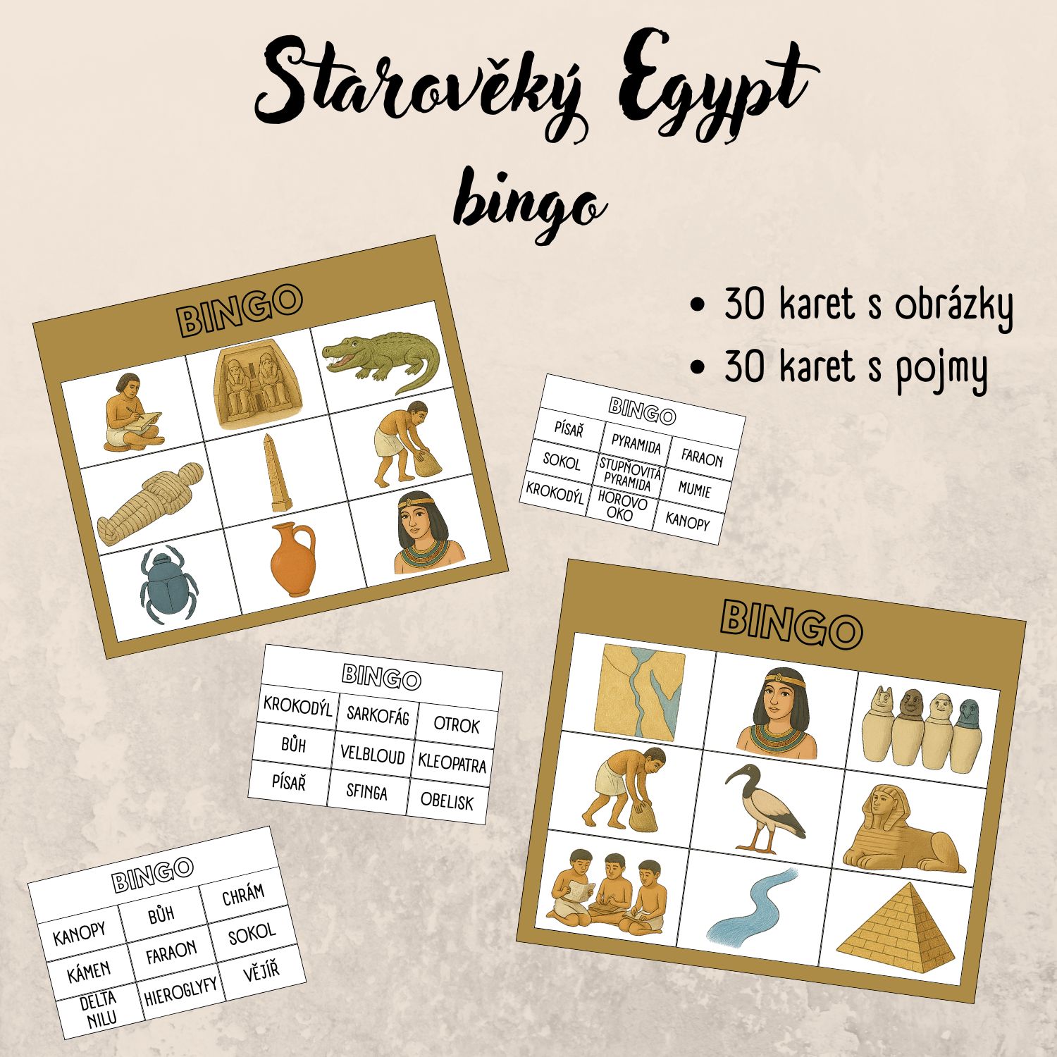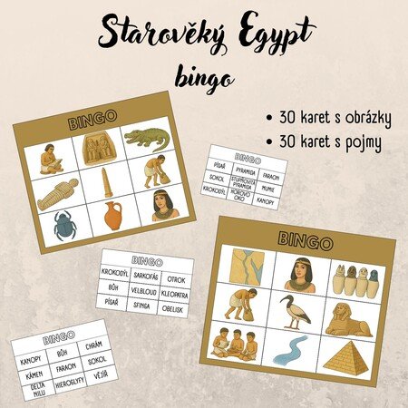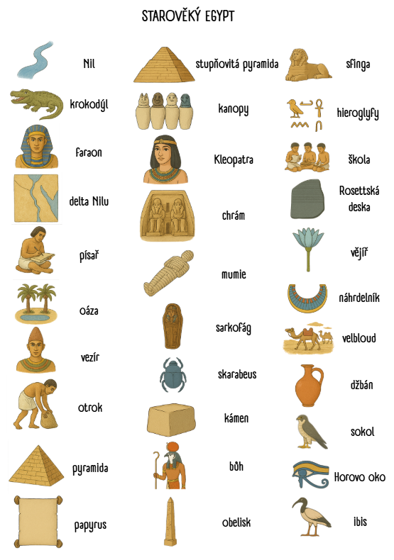 Soubor obsahuje:2x přehled pojmů a definicí32 karet se základními pojmy32 karet s egyptskými bohypřehled pojmůjednoduchý popis pojmů30 karet s obrázky ze starověkého Egypta30 karet se slovy