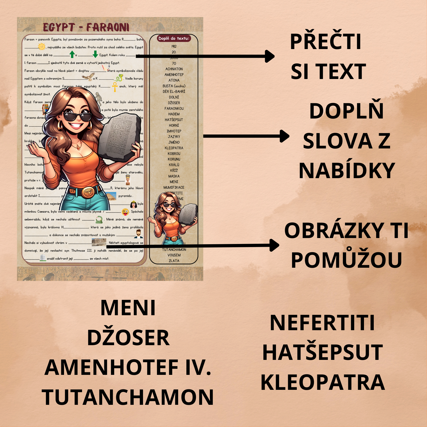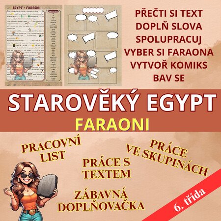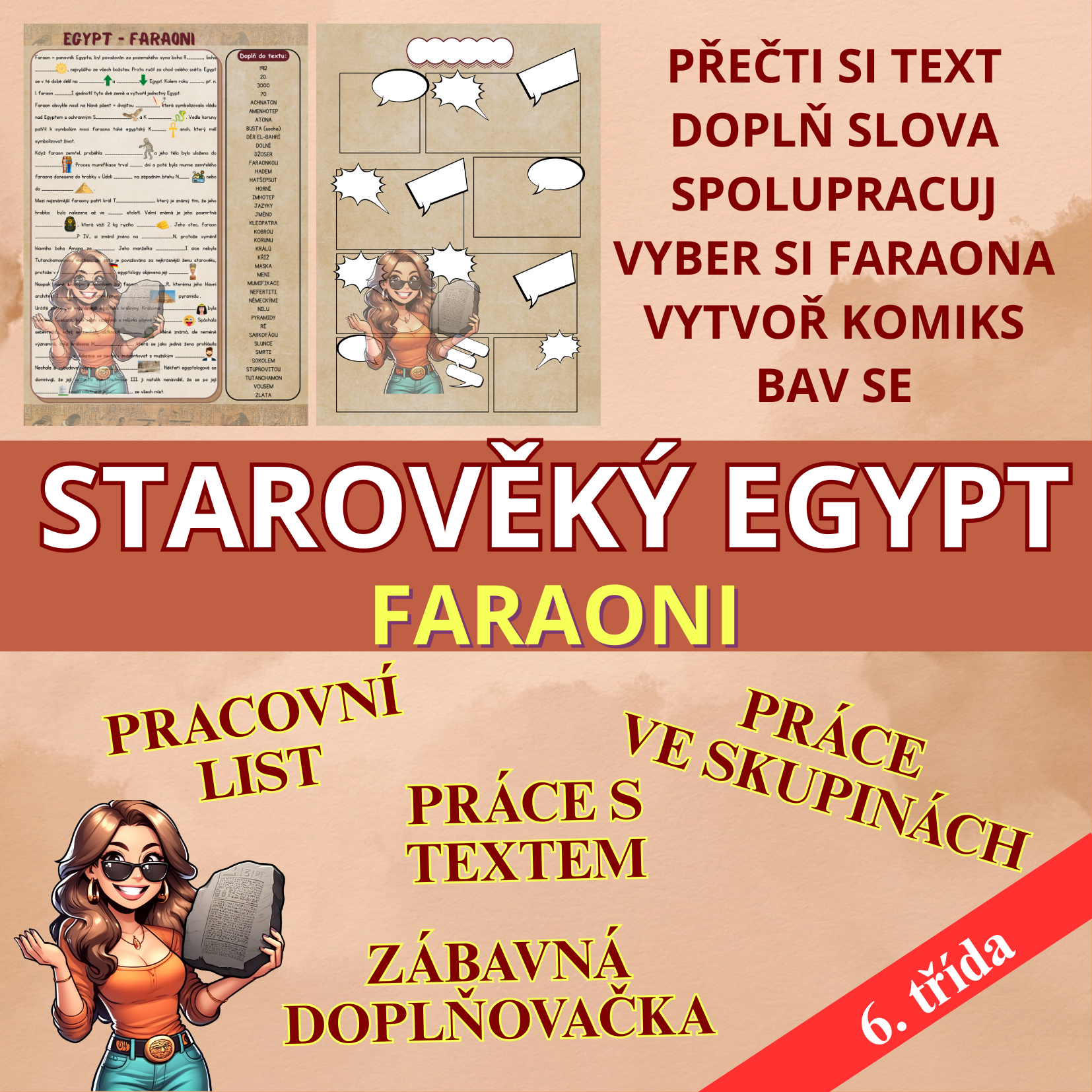 Hravý pracovní list k dějinám starověkého Egypta – doplňování podle obrázků a slov, práce žáků ve dvojicích či skupinách. Komiksová šablona pro ověření pochopení a zábavu. Stačí vytisknout a učit! Součástí balíčku je i černobílá verze.