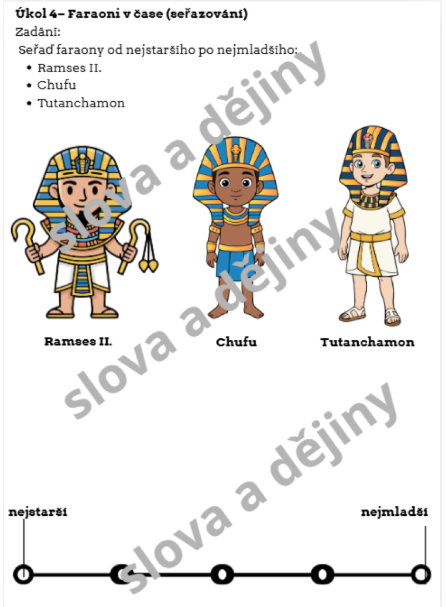 - Úkol 4 – Faraoni v čase: Seřazení slavných panovníků (Chufu, Tutanchamon, Ramses II.) na časovou osu.