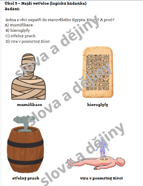 - Úkol 5 – Najdi vetřelce: Logická hádanka na rozpoznání předmětu, který do starověku nepatří (střelný prach).