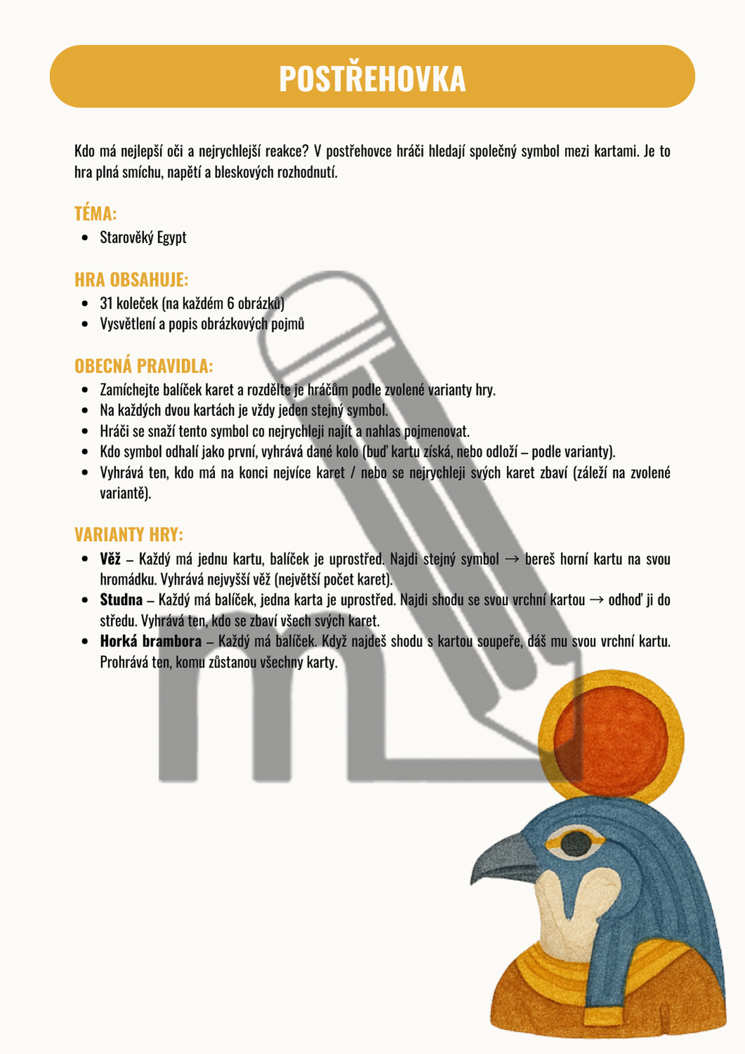 Kdo má nejlepší oči a nejrychlejší reakce? V postřehovce hráči hledají společný symbol mezi kartami. Je to hra plná smíchu, napětí a bleskových rozhodnutí.