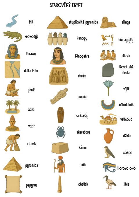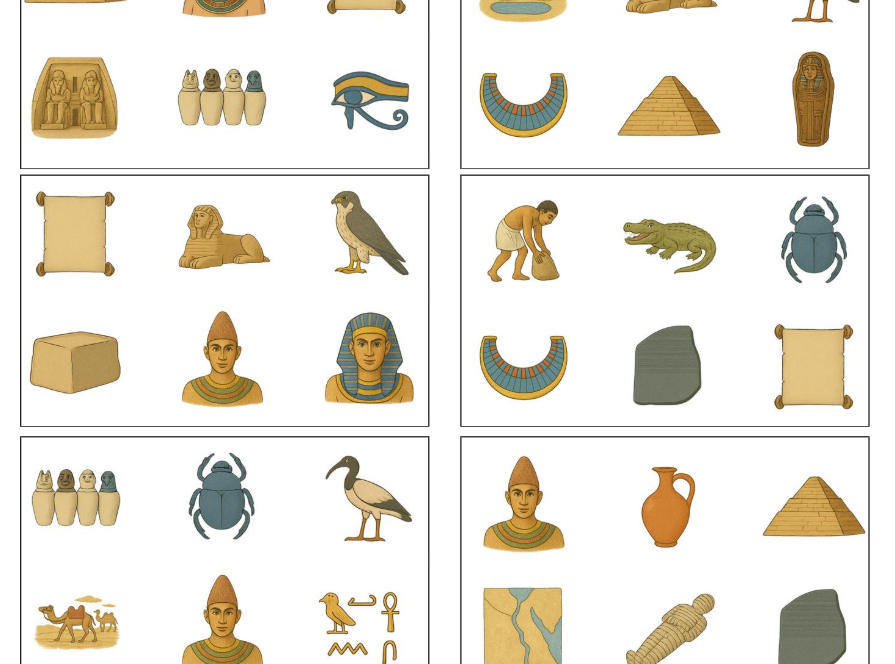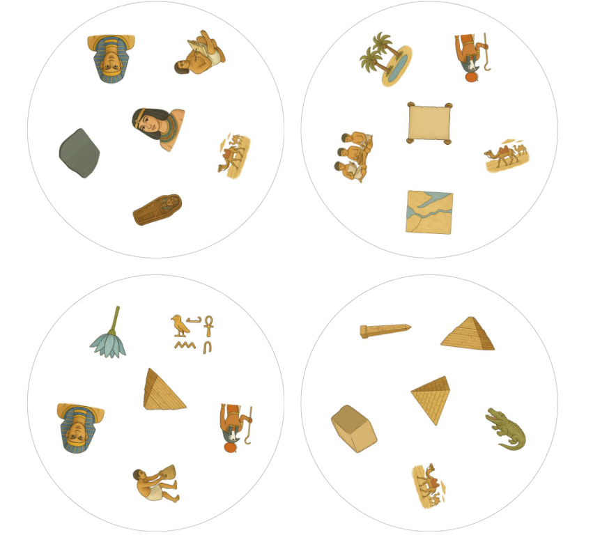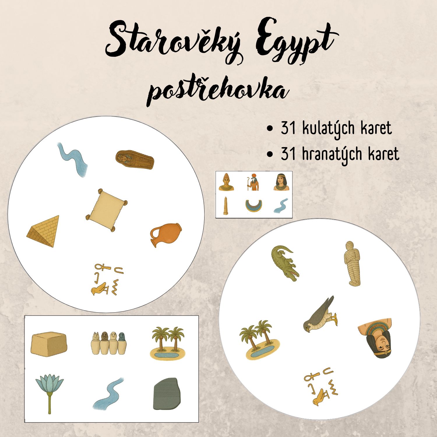 31 kulatých karet s obrázky na téma starověký Egypt