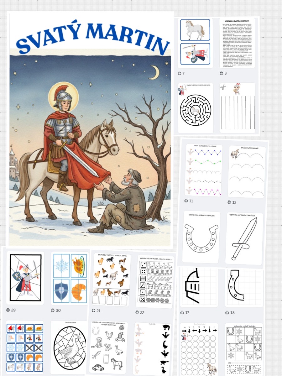 SOUBOR OBSAHUJE 35 STRANgrafomotorikatradice sv. Martindemonstrační obrázkymatematické představydokreslování obrázkůkolíčkováníšipkováníomalovánkypísmenkavizuální představysudokupuzzlebludiště