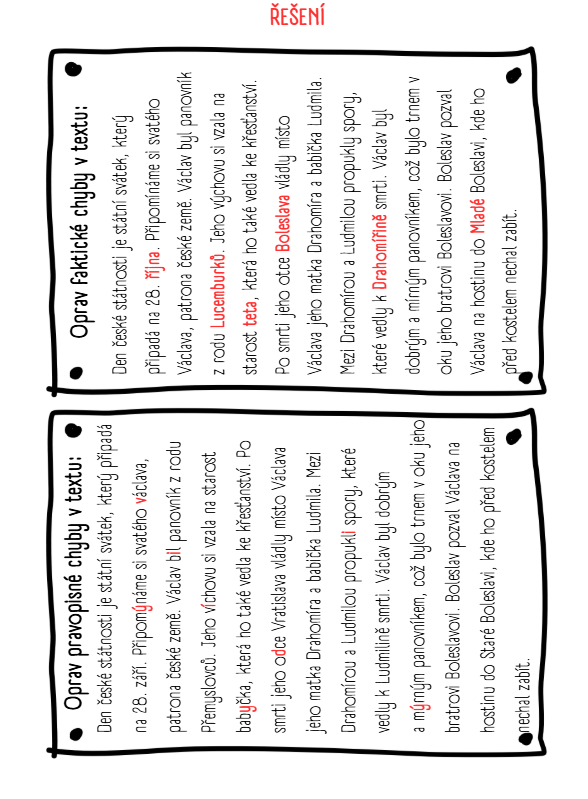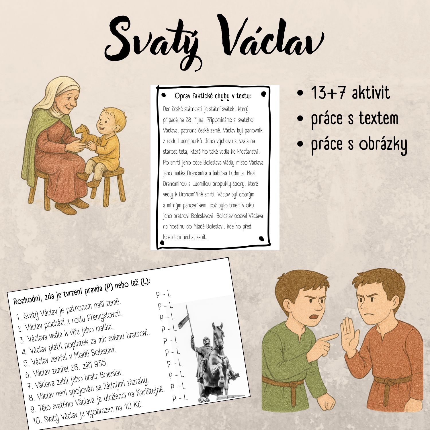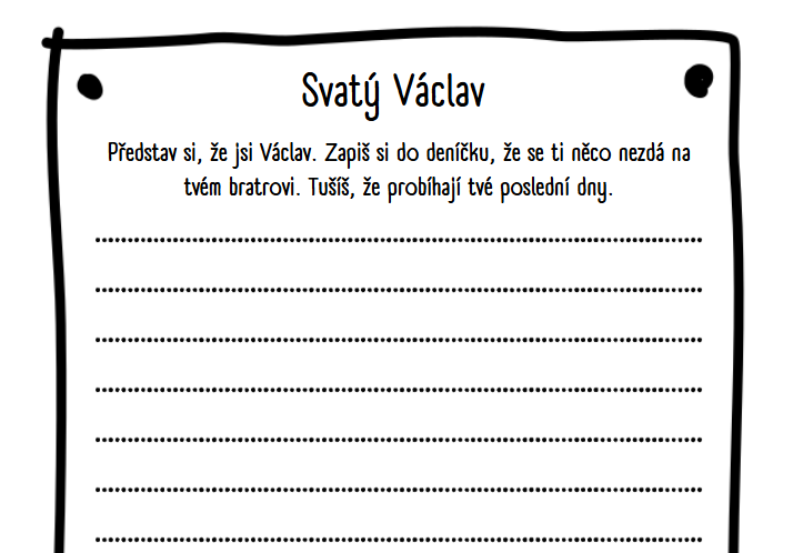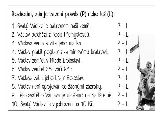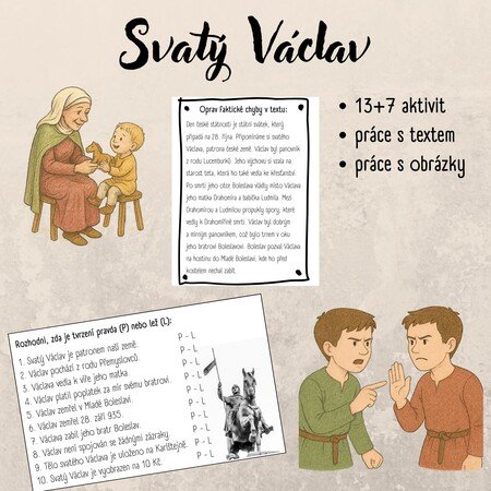 Soubor aktivit na seznámení se s tématem svatý Václav. Celý soubor je o práci s textem. Text můžete předčítat, nebo ho poskytnout dětem k nahlédnutí.