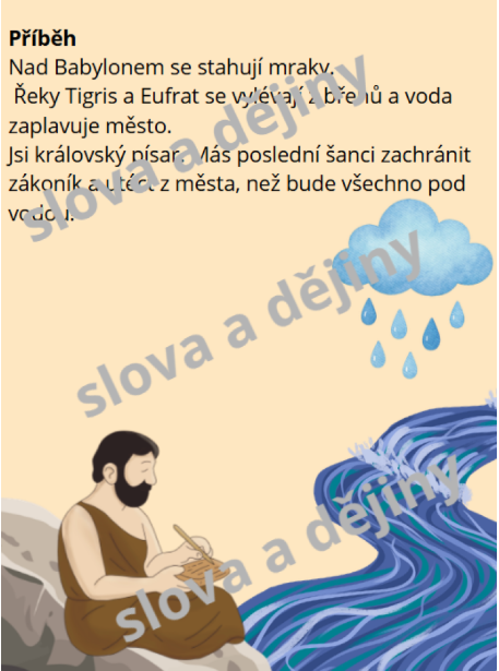 Tato úniková hra vtáhne žáky do napínavého příběhu starověkého Babylonu. Jako královští písaři mají za úkol zachránit Chammurapiho zákoník před blížící se povodní na řekách Eufrat a Tigris. Materiál je koncipován pro práci v týmech, která podporuje spolupráci, logické myšlení a upevňuje znalosti o jedné z nejstarších civilizací světa.