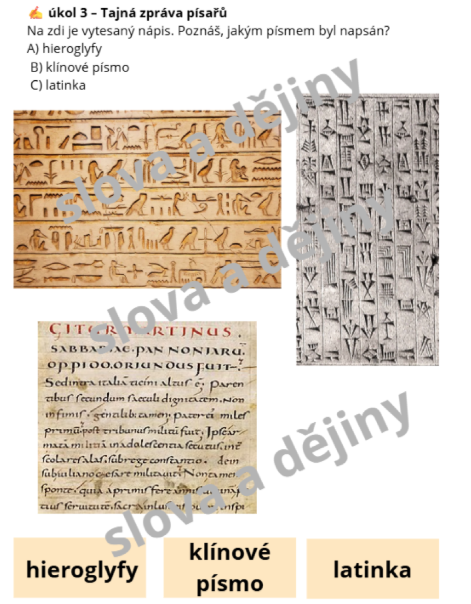 - Tajná zpráva písařů: Rozpoznávání typů písma (klínové, hieroglyfy, latinka).