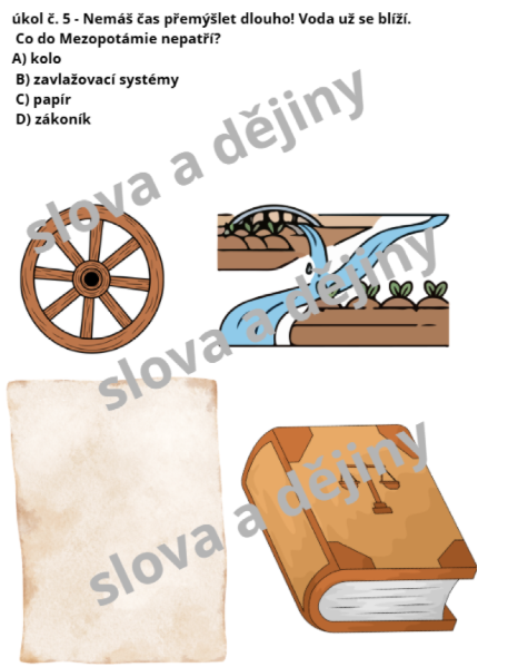 - Co do Mezopotámie nepatří?: Prověření znalostí o vynálezech (kolo, závlažování vs. papír).