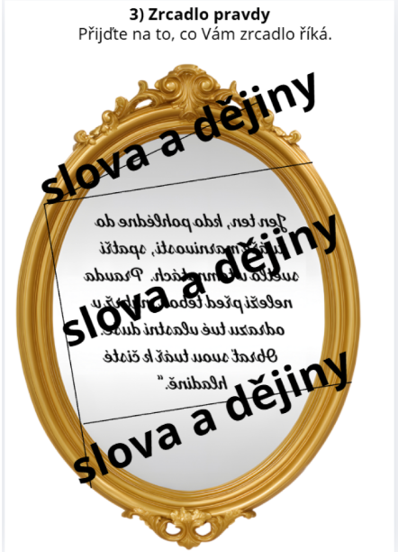 - Zrcadlo pravdy: Práce se zrcadlově obráceným textem. Úkol vyžaduje složení „střepů“ rozbitého zrcadla.