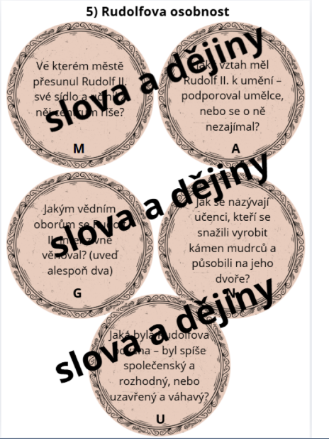 - Rudolfova osobnost: Kvíz o životě na císařském dvoře. Správné odpovědi tvoří finální tajenku: MAGNUM OPUS.