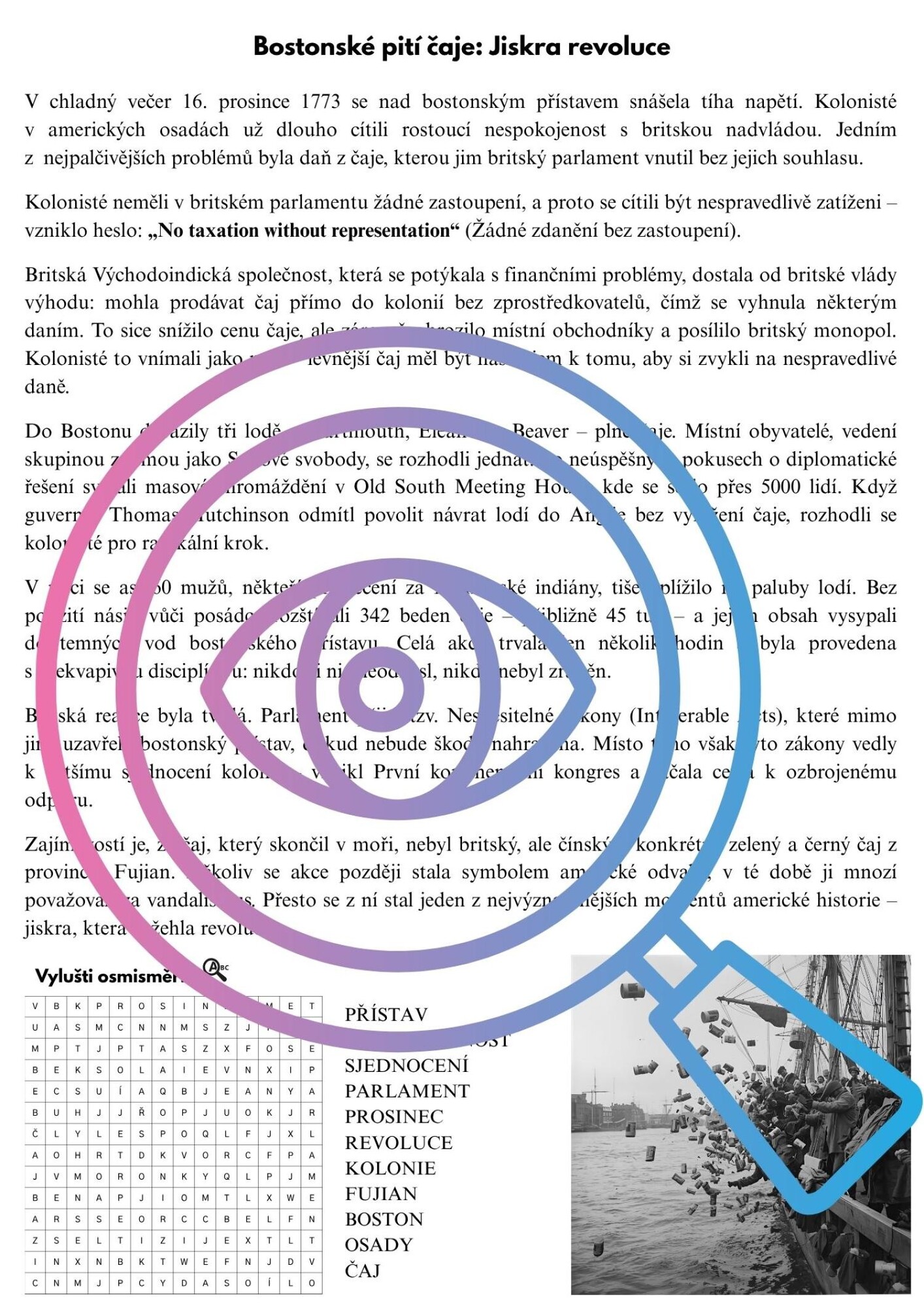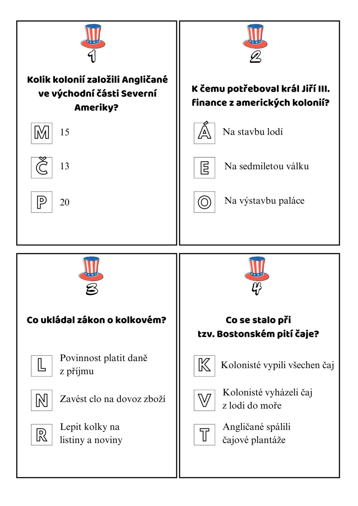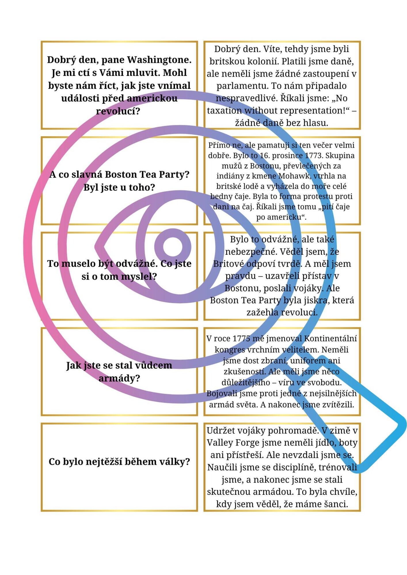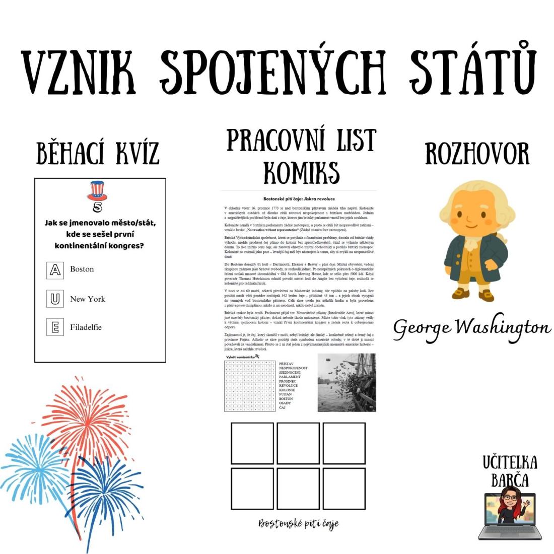 Tento materiál obsahuje běhací kvíz s 8 otázkami, pracovní list na tzv. Bostonské pití čaje, šablonu na komiks a rozhovor s G. Washingtonem a muži z Bostonu.