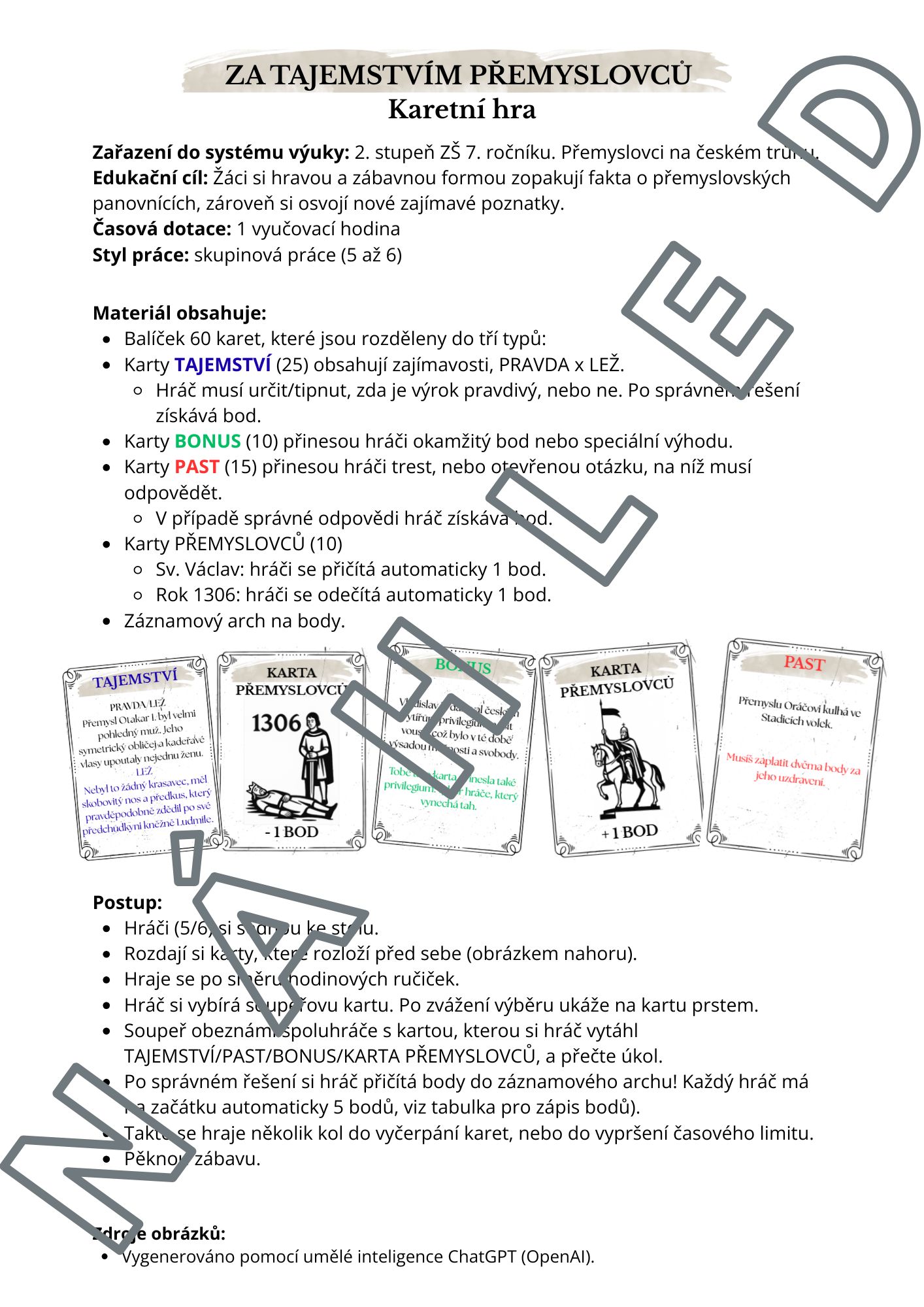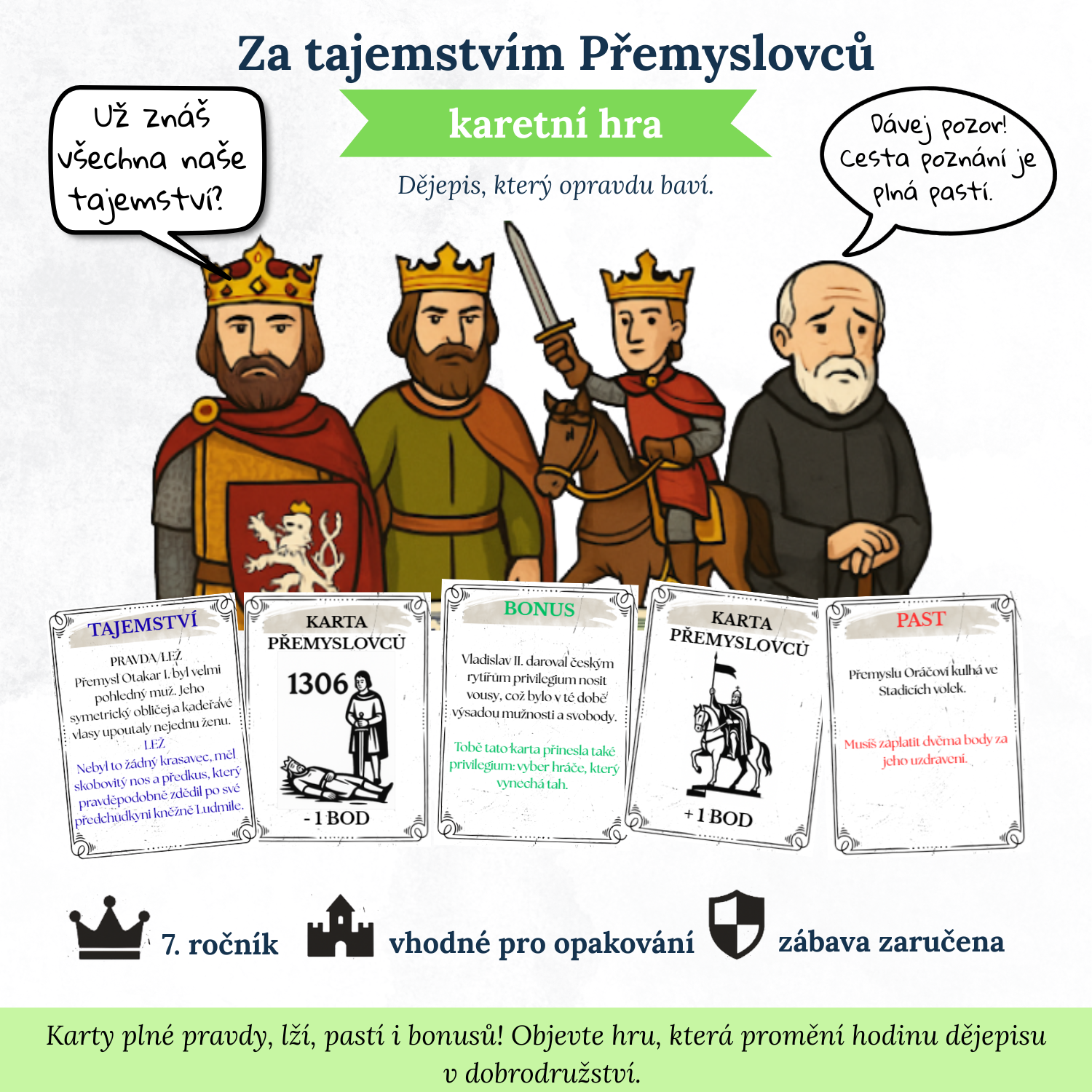 Zábavná karetní hra, díky které si žáci hravou formou procvičí znalosti o přemyslovských panovnících. Učivo si zapamatují i bez biflování. Zábava a vědomosti v jednom. Skupinová práce, soutěž, napětí. Vyzkoušejte a uvidíte!