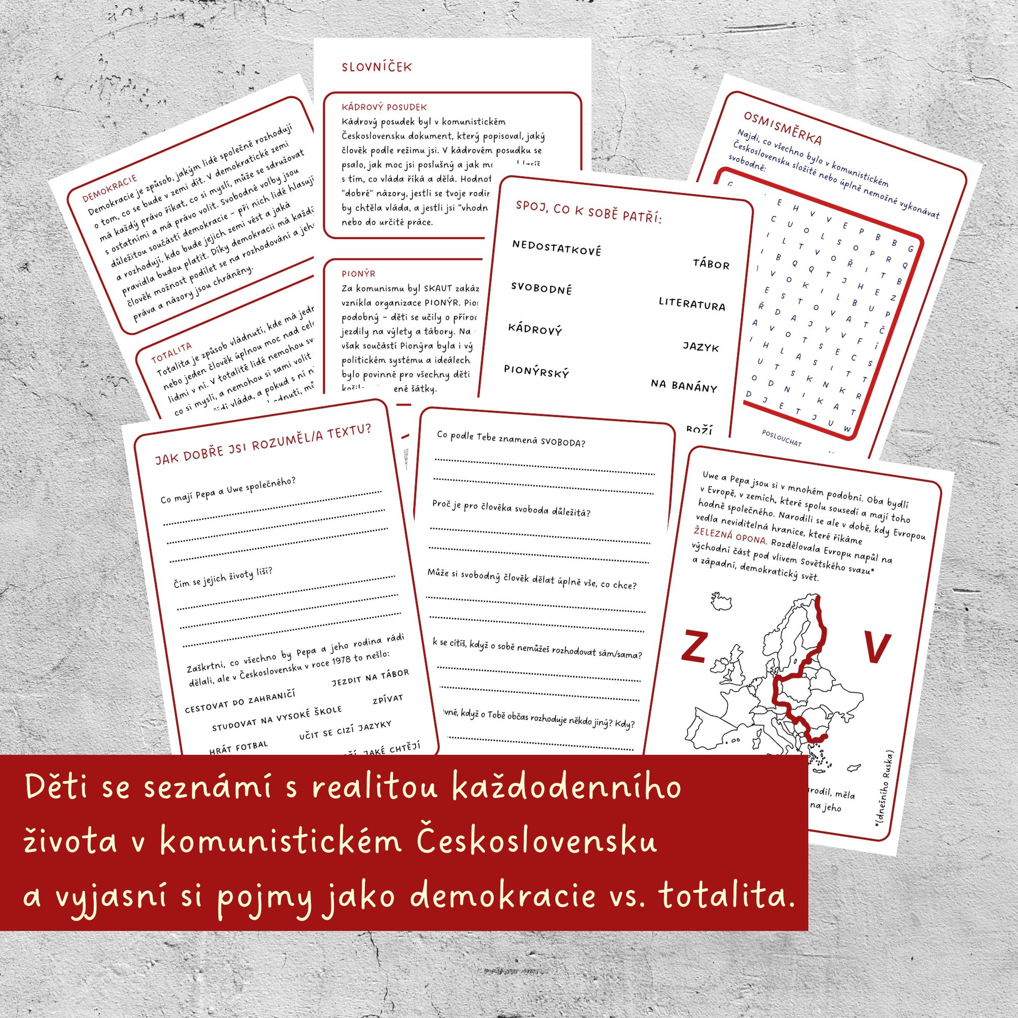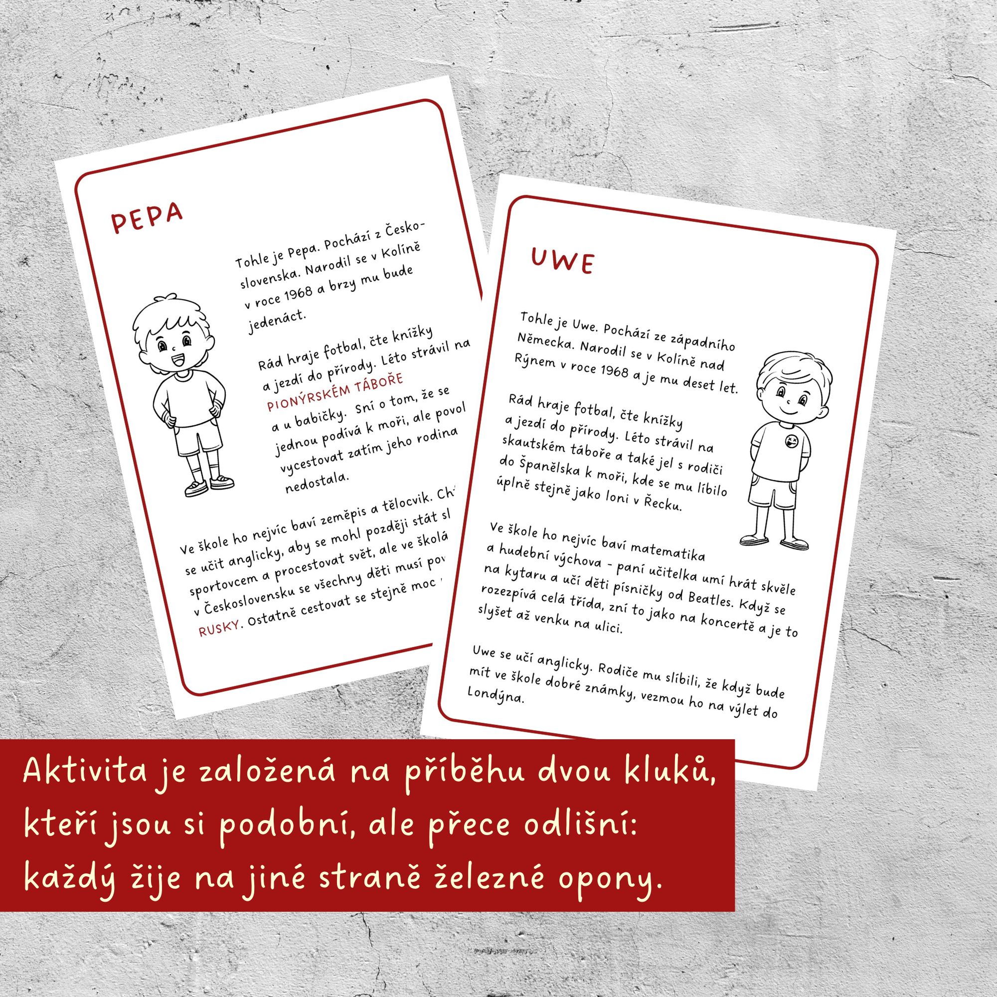 🔴Uwemu je deset, hrát hraje fotbal, čte a cestuje. Pepovi je taky deset, taky rád hraje fotbal, čte a cestovat by chtěl, ale nemůže. Děti zjistí, jaké těžkosti přinášel každodenní život v totalitní zemi, zkusí porovnat život v západní a východní Evropě, naučí se základní pojmy a zamyslí se nad důležitostí svobody jedince. Seznámí se se základním rozdílem mezi životem v demokratické a v totalitní zemi a svoje znalosti upevní pomocí několika hravých aktivit.