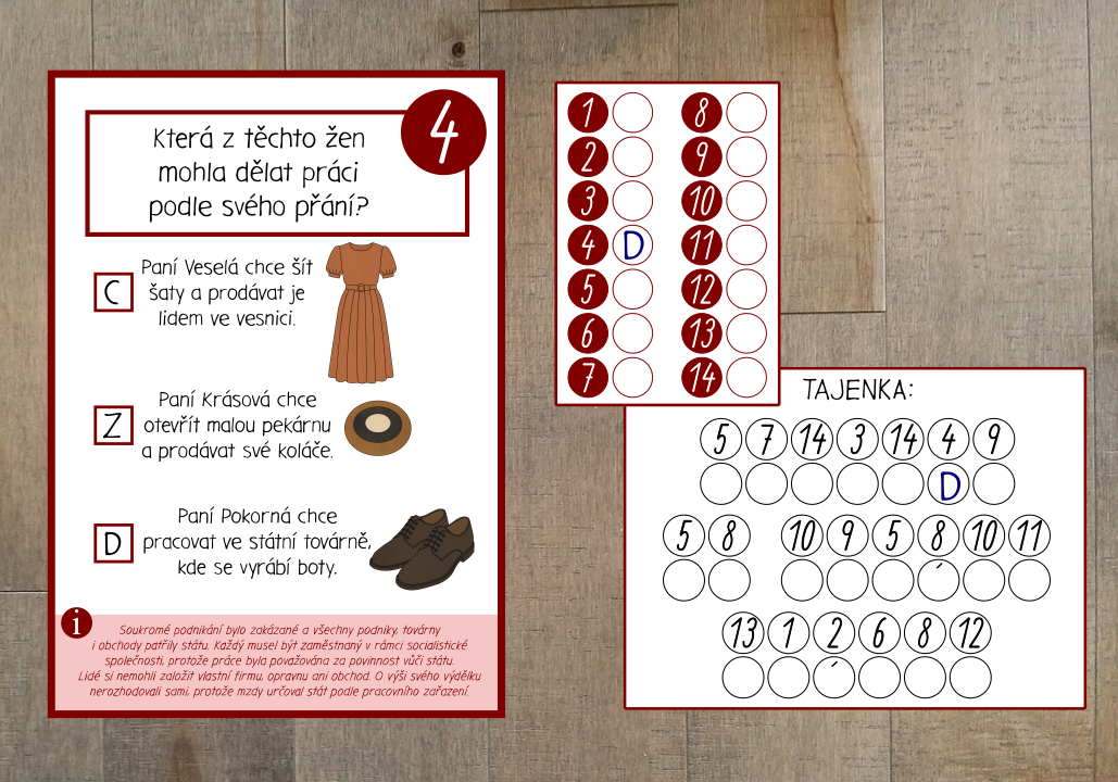 Šifrovací hra tematicky zaměřená na období komunismu. Děti se vydají po stopách minulosti a prostřednictvím otázek objeví, jak se žilo v době, kdy svoboda nebyla samozřejmostí, lidé museli stát fronty na obyčejné zboží a o spoustě věcí rozhodoval stát.