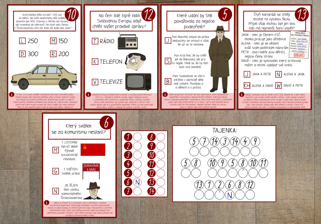 Hra obsahuje 14 listů s otázkami. Písmeno u správné odpovědi děti doplní do šifrovací kartičky a na konci vyluští tajenku, která zní: "Svobodu si musíme chránit." Součástí každé karty je i vysvětlující text, který dětem přibližuje historické souvislosti a pomáhá jim lépe pochopit, jak se v dané době žilo.