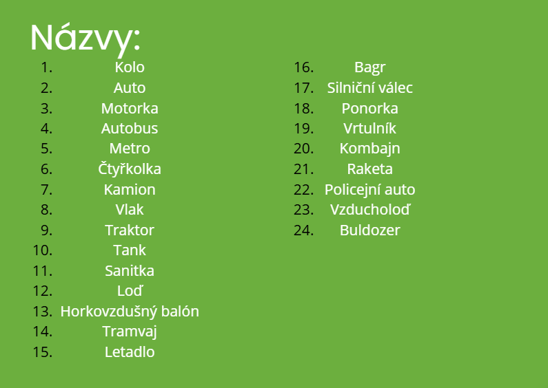 Dopravní výchova>Nezařazené k předmětu>Já mám, kdo má>Batole (1 - 3 roky)>MŠ>Školní družina>MŠ - předškoláci>1.>2.>🚘 Dopravní prostředky