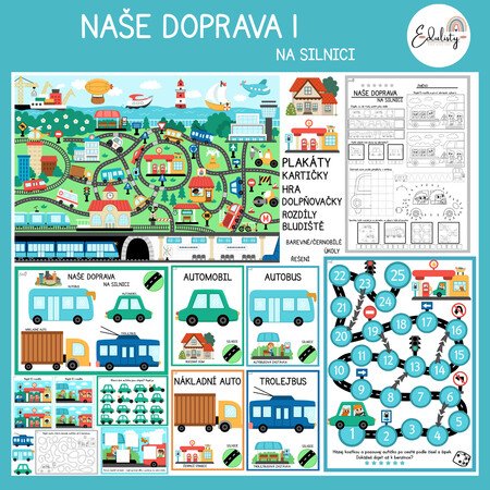 Tento hravý výukový materiál představuje dětem vybrané dopravní prostředky, se kterými se mohou setkat na silnici – automobil, autobus, trolejbus i nákladní auto.