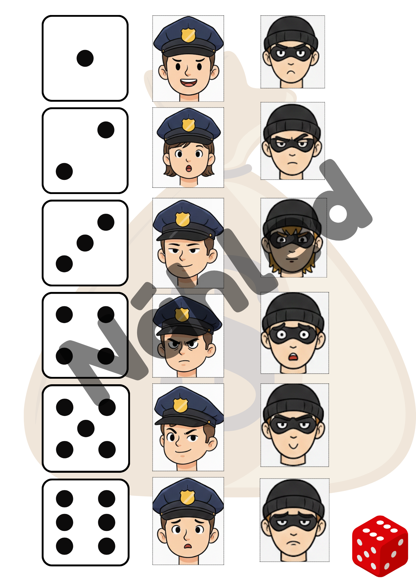 - 12 kruhových žetonů s předměty ke stříhání (např. pouta, stetoskop, hasicí přístroj, přilby).
