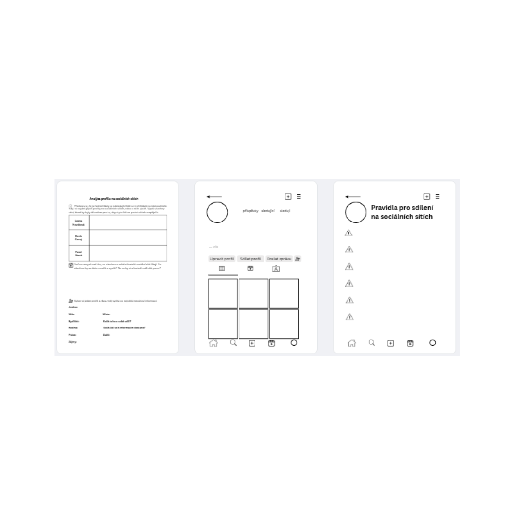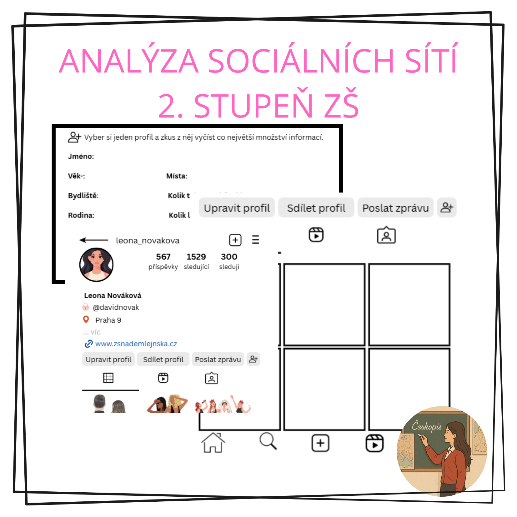 Materiál slouží k rozvoji digitální gramotnosti, kritického myšlení a schopnosti zodpovědně vystupovat na internetu. Žáci se seznámí s fiktivními profily, které napodobují skutečné prostředí sociálních sítí. Tyto profily následně analyzují.