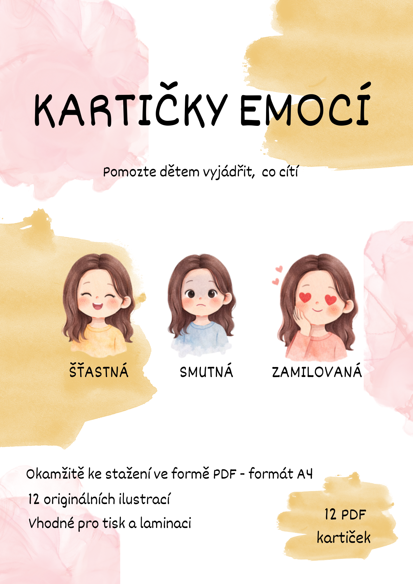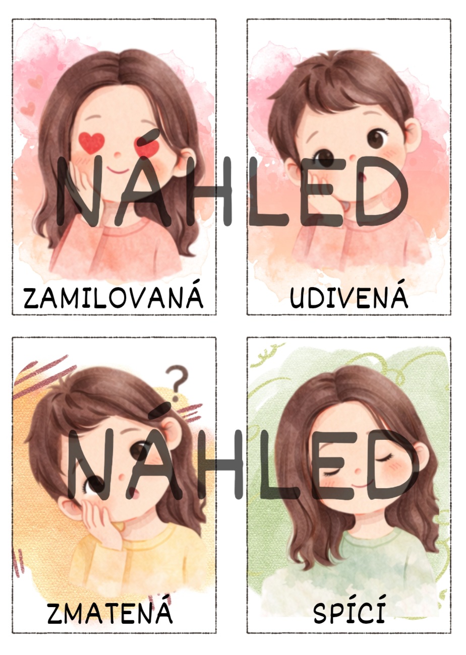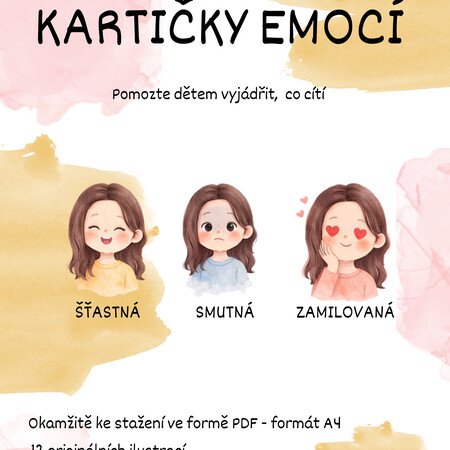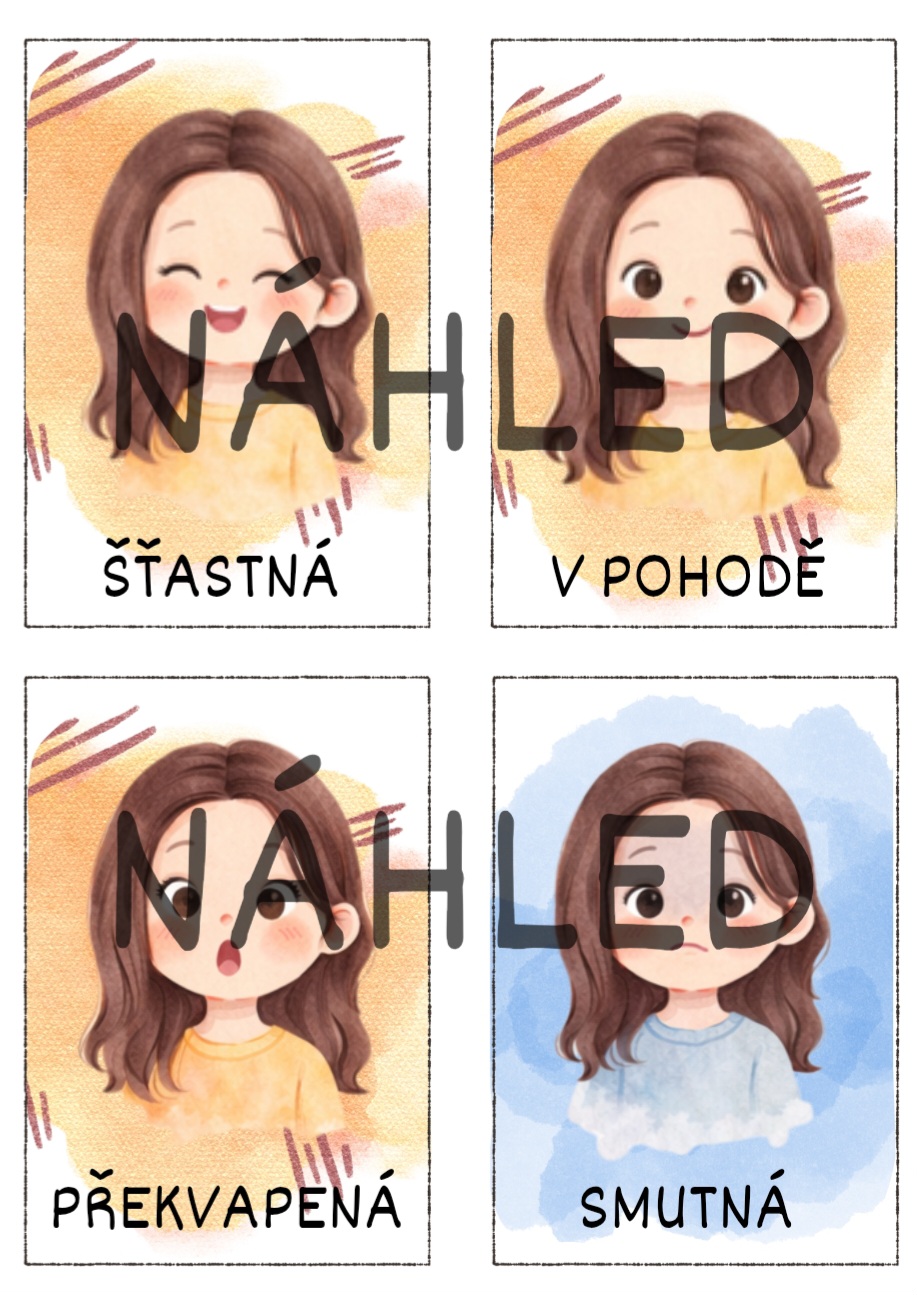 Soubor obsahuje 12 originálních ilustrovaných kartiček emocí, které dětem pomáhají rozpoznat, pojmenovat a vyjádřit vlastní pocity. Kartičky jsou vhodné pro práci ve třídě, v družině, při individuální práci i v rámci speciální pedagogiky.