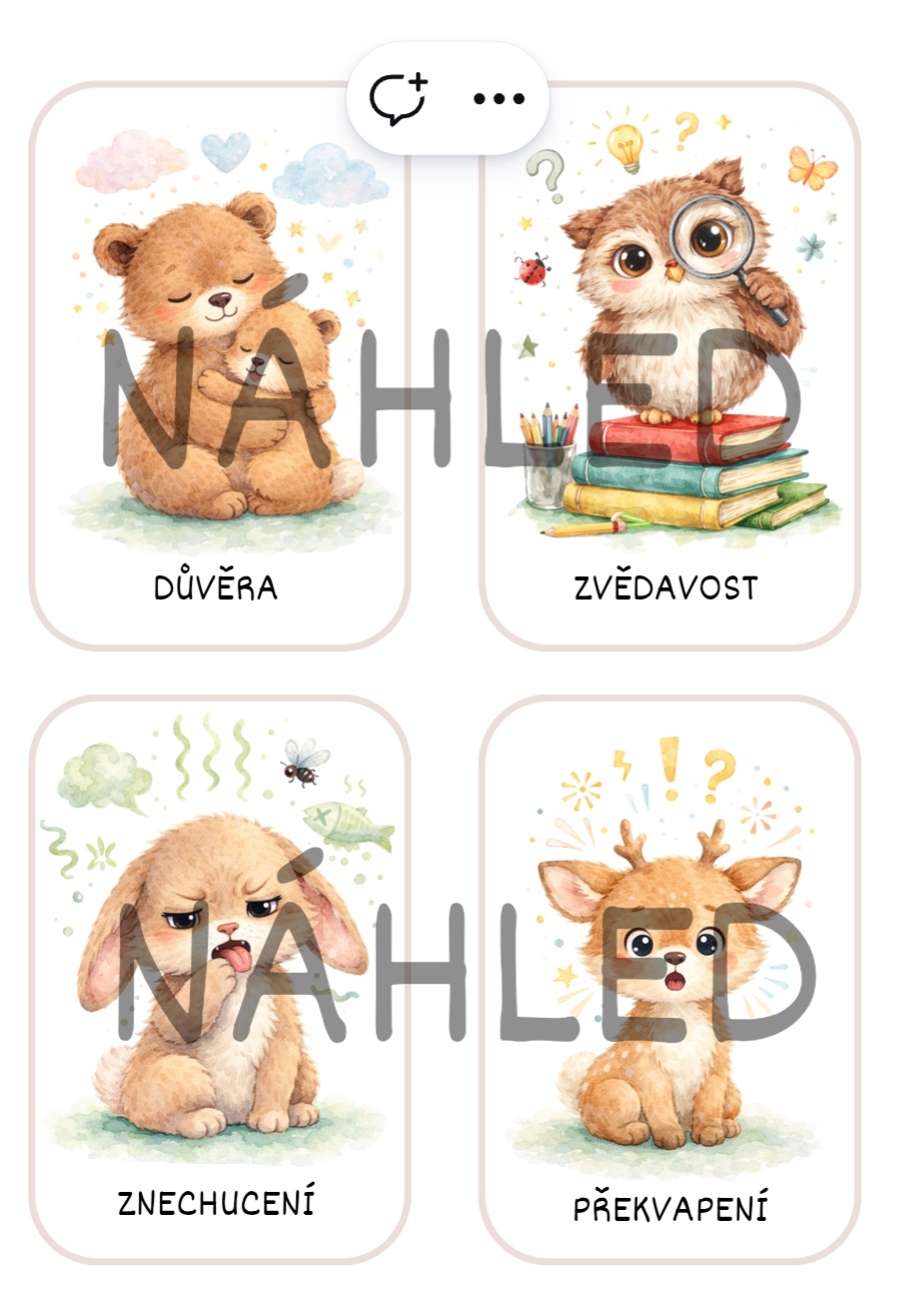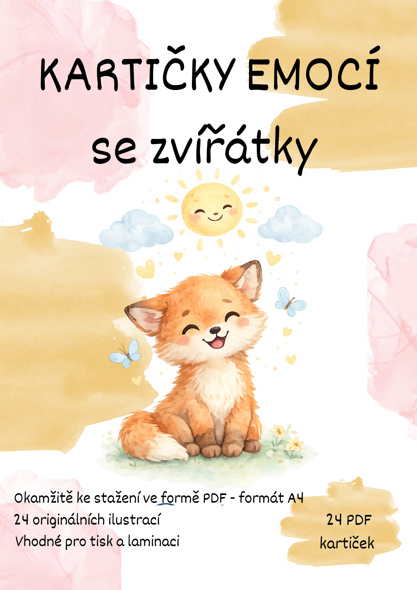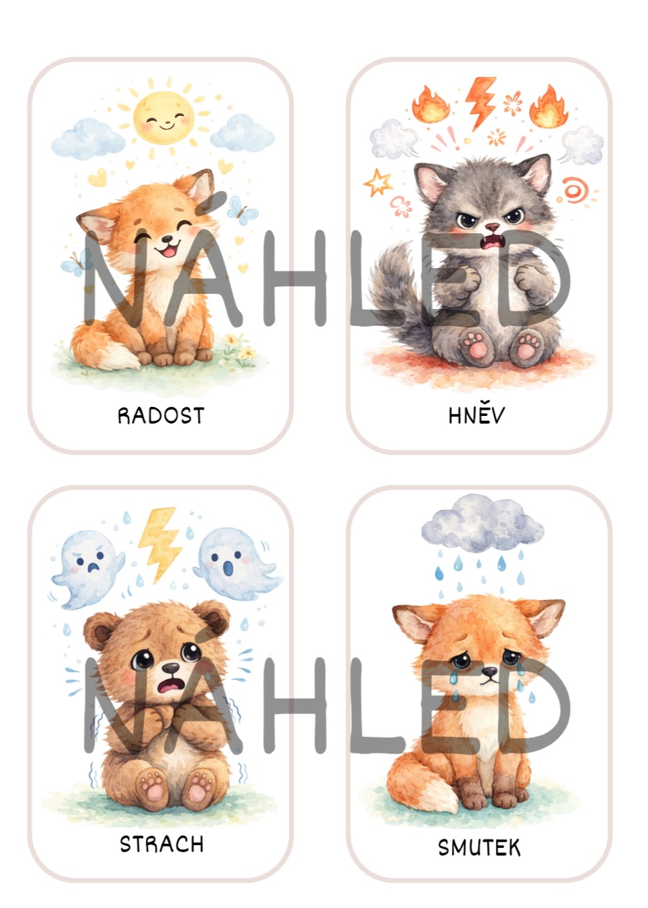 Soubor obsahuje 24 originálních ilustrovaných kartiček emocí, které dětem pomáhají rozpoznat, pojmenovat a vyjádřit vlastní pocity. Kartičky jsou vhodné pro práci ve třídě, v družině, při individuální práci i v rámci speciální pedagogiky.