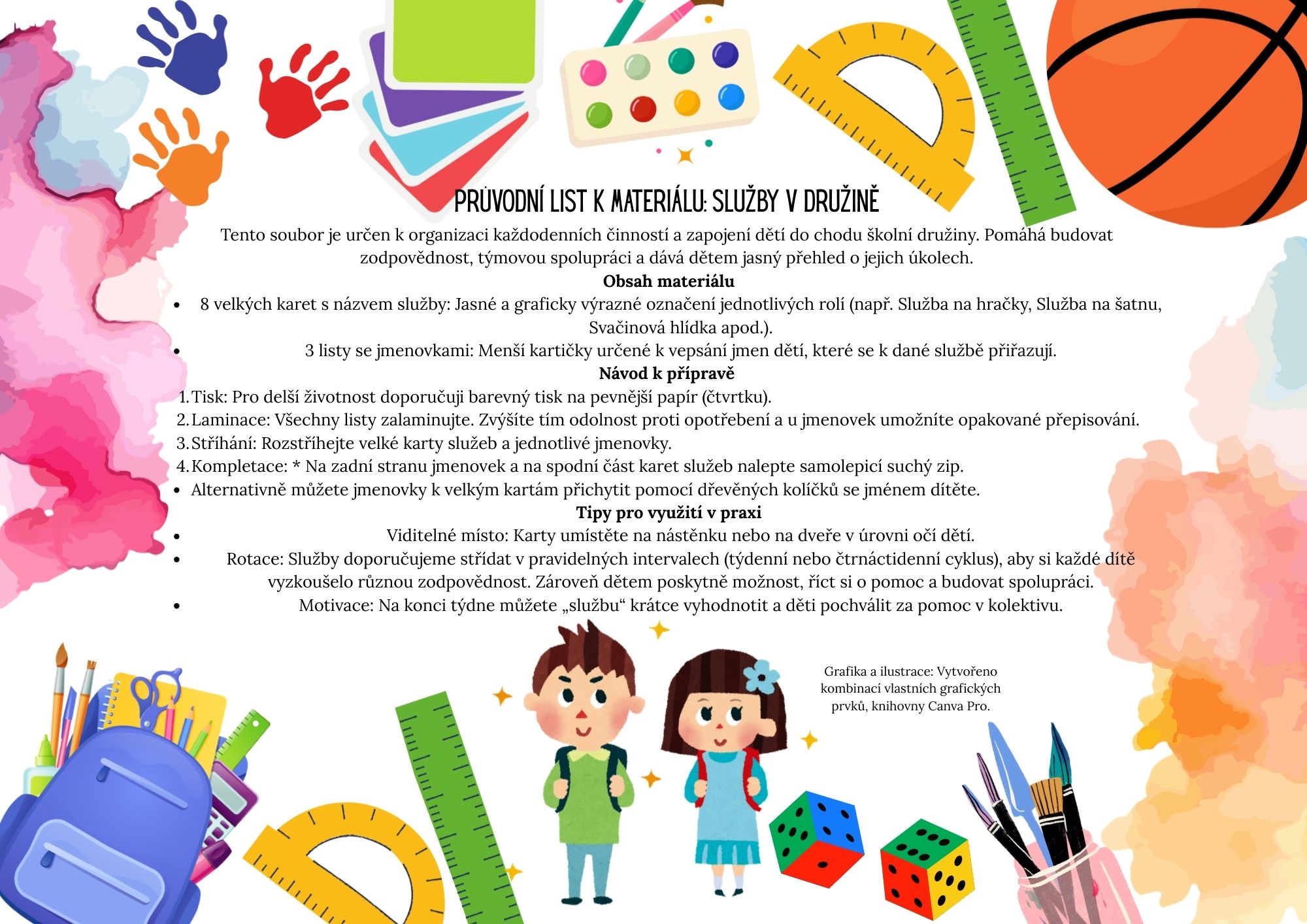 Hledáte způsob, jak do družiny vnést řád a naučit děti zodpovědnosti hravou formou? Tento pomocník vám pomůže přehledně rozdělit každodenní úkoly a zapojit malé pomocníky do chodu oddělení.
