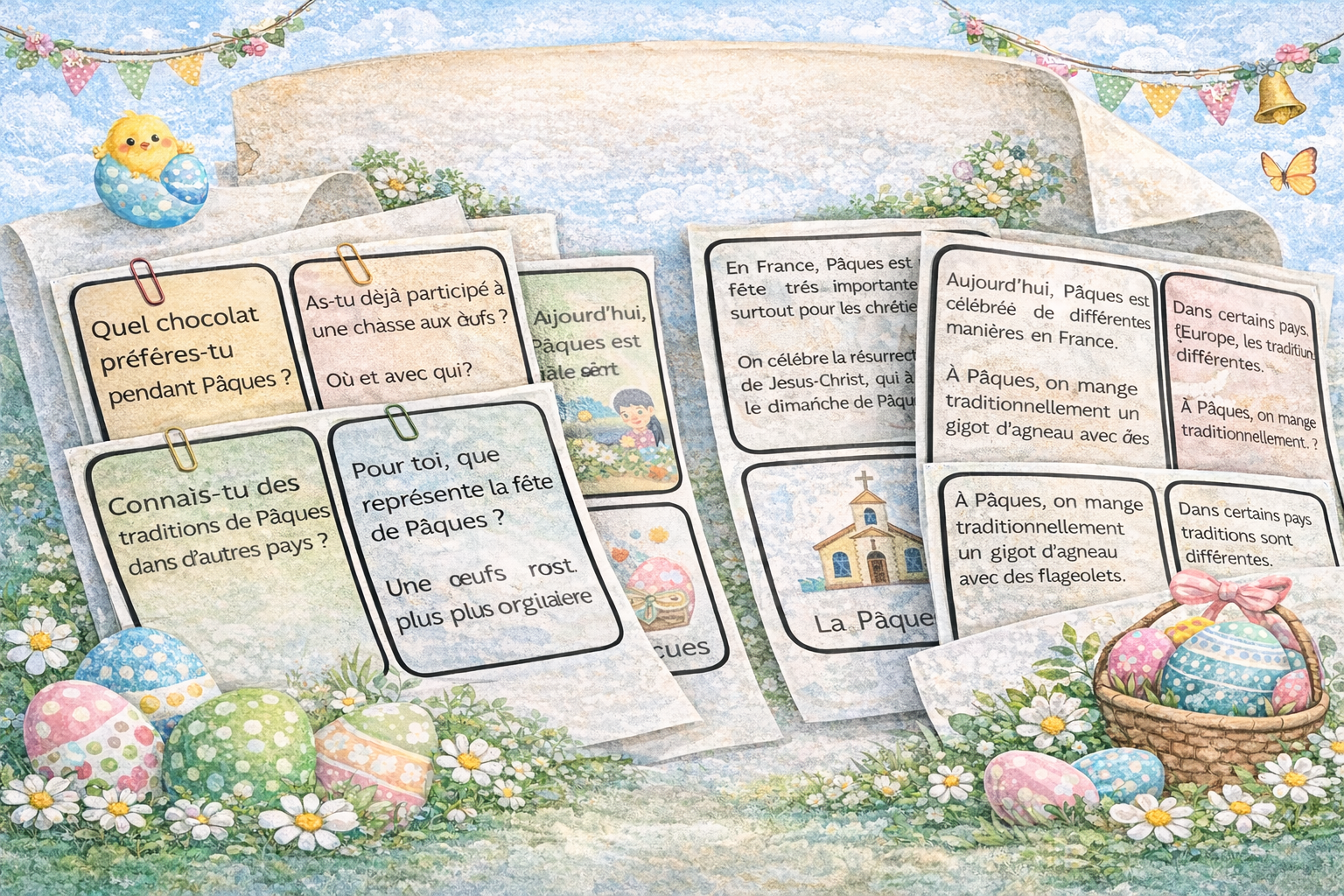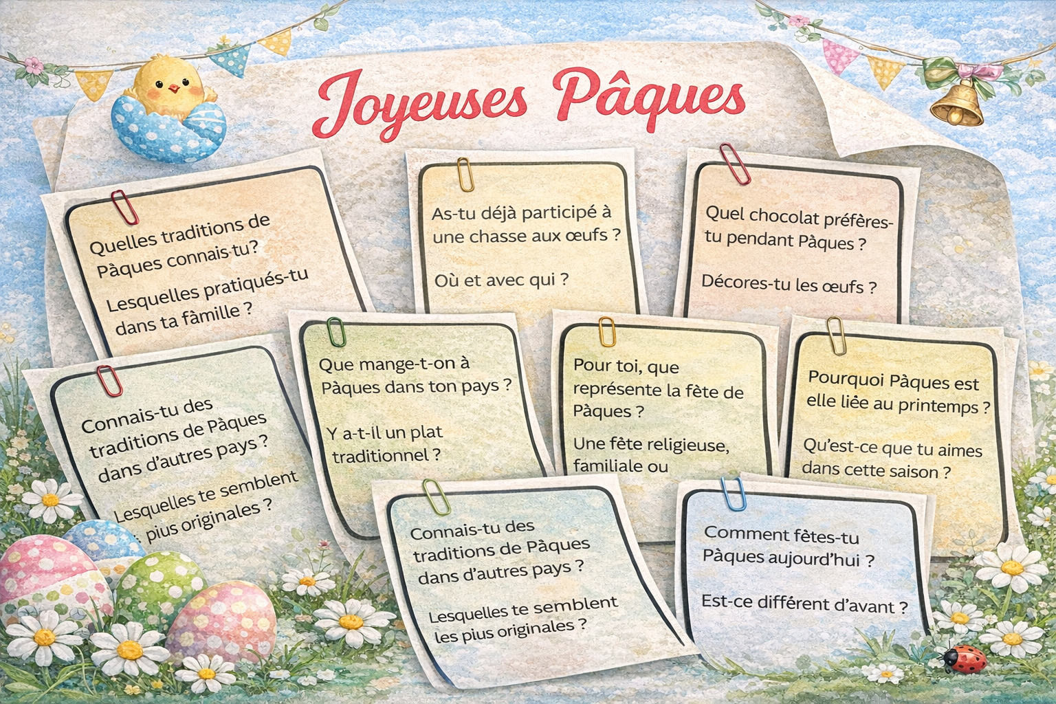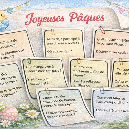 Materiál je určen pro žáky úrovně A2–B1 a propojuje čtení s porozuměním s rozvojem mluveného projevu. Kartičky seznamují s velikonočními tradicemi ve Francii a zároveň podporují aktivní diskusi a interkulturní srovnání.