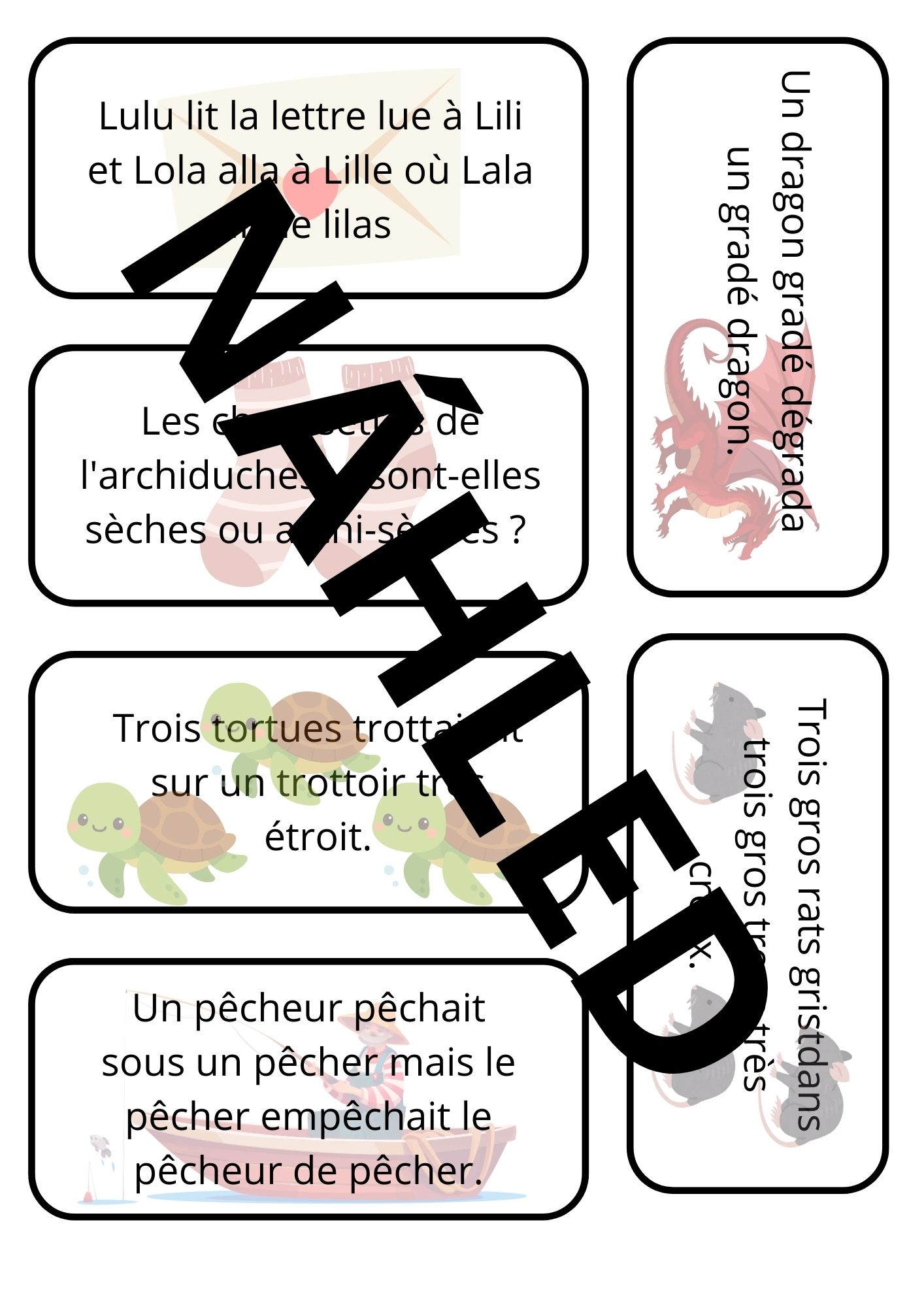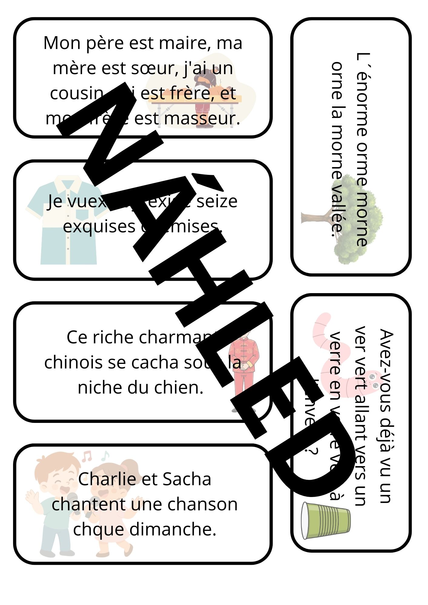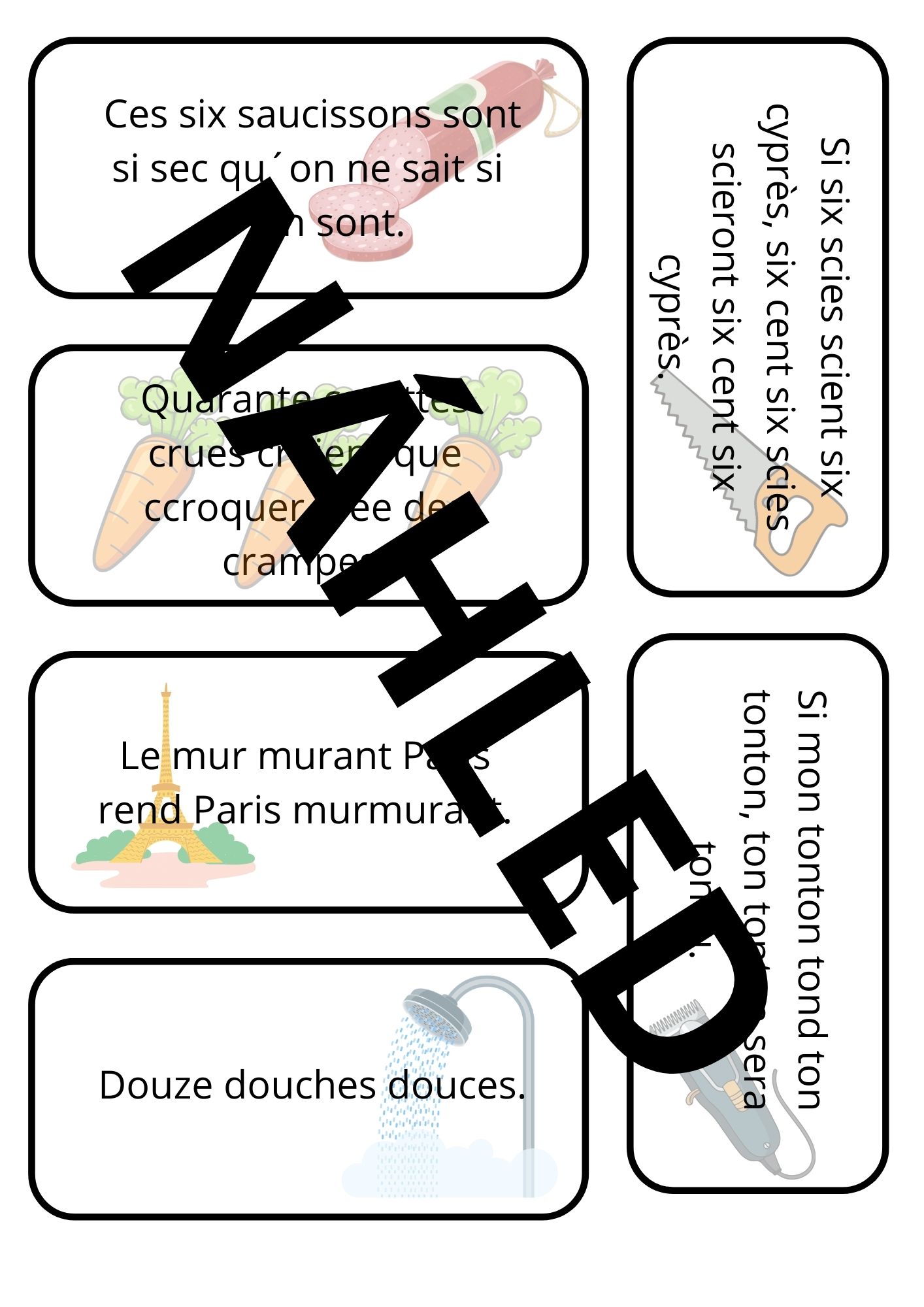 Soubor obsahuje čtyřstránkový soubor francouzských jazykolamů zaměřených na procvičování problematických hlásek a fonetických jevů (např. /ʃ/, /ʒ/, /r/, kontrast znělých a neznělých souhlásek, nosovky, homonyma typu ver–vert–verre–vers).